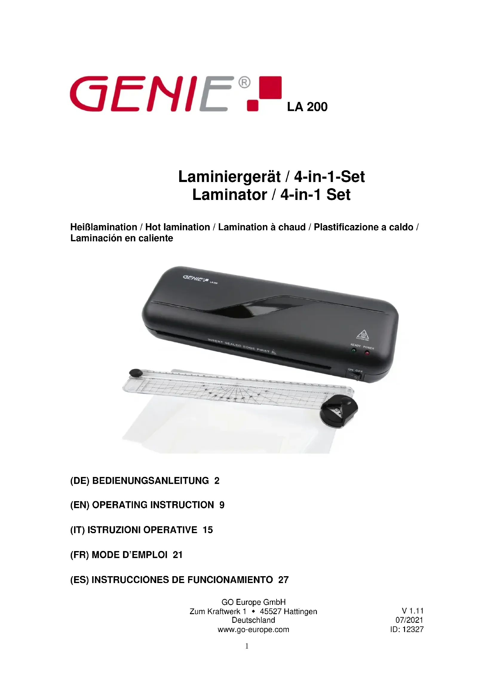Livraison : Plastifieuse GENIE LA 200 Mode d´emploi Règle à découper Arrondisseur d'angles Pochettes de plastification (10 × A4, 10 × A5, 10 × A6, 20 × taille d'une carte de visite)