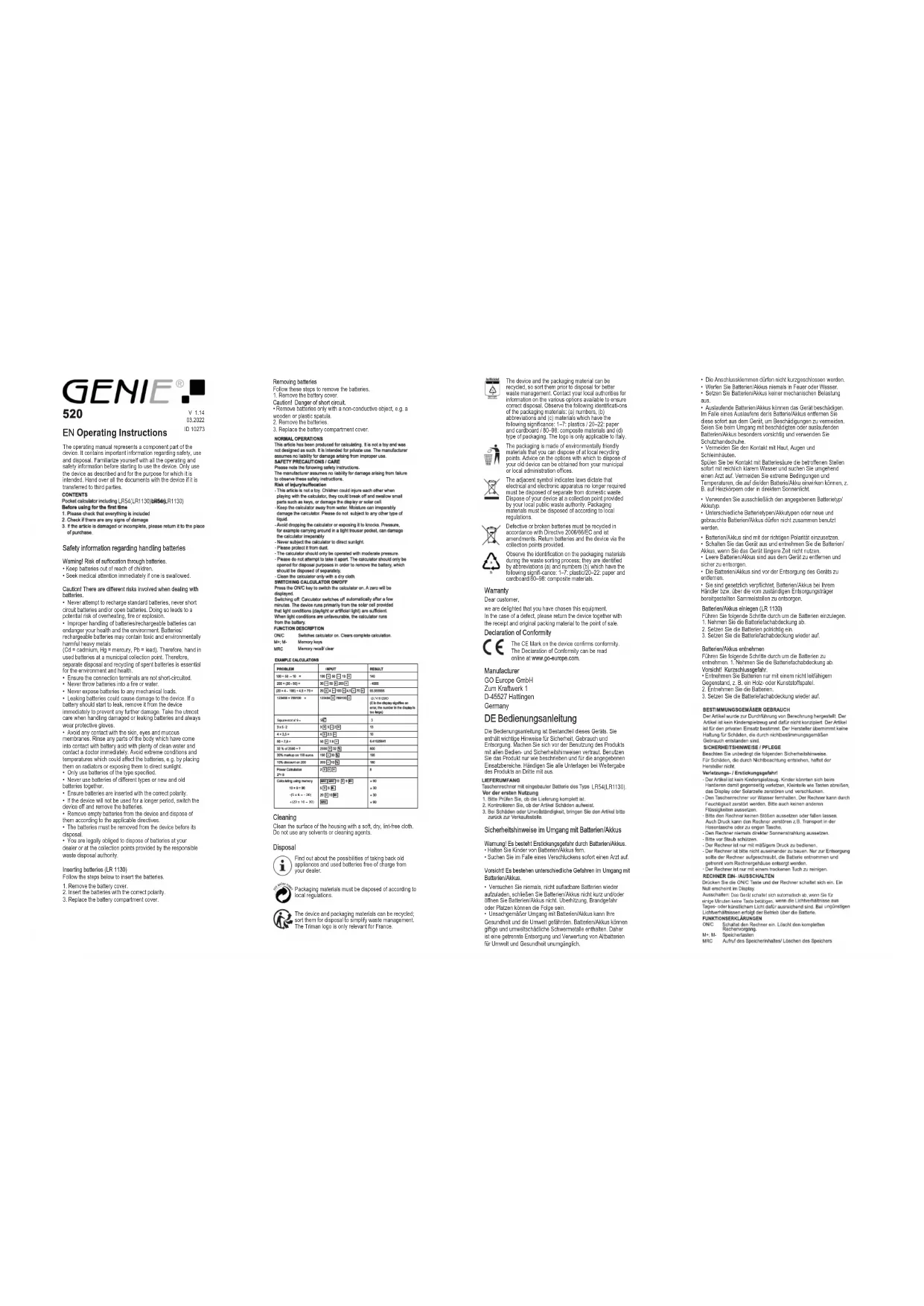 Nettoyage Nettoyez la surface du boîtier avec un chiffon doux, sec et non pelucheux. N'utilisez pas de produits d'entretien et de solvants. Élimination Informez-vous sur les possibilités de reprise gratuite des appareils usagés et des piles usagées chez de votre revendeur. Les matériaux d'emballage doivent être éliminés conformément aux réglementations locales. L'appareil et les matériaux d'emballage sont recyclables, éliminez-les séparément pour une meilleure gestion des déchets. Le logo Triman est valable en France uniquement. L'appareil et les emballages sont recyclables. Éliminez-les séparément pour une meilleure gestion des déchets. Informez-vous auprès de votre commune sur les possibilités d'une élimination adéquate. Tenez compte du marquage suivant sur les emballages : (a) numéros, (b) abréviations et (c) matériau signifiant ce qui suit : 1–7 : plastiques / 20– 22 : papiers et cartons / 80–98 : composites, ainsi que (d) genre d'emballage. Ce logo n'est valable que pour l'Italie. L'emballage est constitué de matériaux recyclables que vous pouvez apporter à des centres de collecte locaux qui se chargent de son recyclage. Renseignez-vous sur les possibilités d'élimination des déchets auprès de l’administration locale. Le symbole ci-contre signifie qu'en raison de dispositions légales, les appareils électriques et électroniques usagés ne doivent pas être éliminés avec les ordures ménagères. Veuillez apporter votre appareil au centre de collecte de l'organisme d'élimination des déchets de votre commune. Éliminez les matériaux d'emballage conformément aux règlements locaux. Les piles défectueuses ou usagées doivent être recyclées conformément à la directive 2006/66/CE et à ses avenants. Apportez les piles et / ou l'appareil aux centres de collecte qui vous auront été proposés. Tenez compte du marquage sur les emballages lorsque vous triez les déchets ; ceux-ci sont dotés d'abréviations (b) et de numéros (a) signifiant ce qui suit : 1–7 : plastiques / 20–22 : papiers et cartons / 80–98 : composites. Garantie Cher client, nous sommes très heureux que vous ayez choisi cet appareil. En cas de défaut, veuillez retourner l’appareil dans son emballage d’origine et accompagné du bon d’achat au magasin où vous l’avez acheté. Déclaration de conformité La conformité est attestée sur l'appareil par le marquage CE. Vous trouverez la déclaration de conformité de ce produit sur le site www.go-europe.com