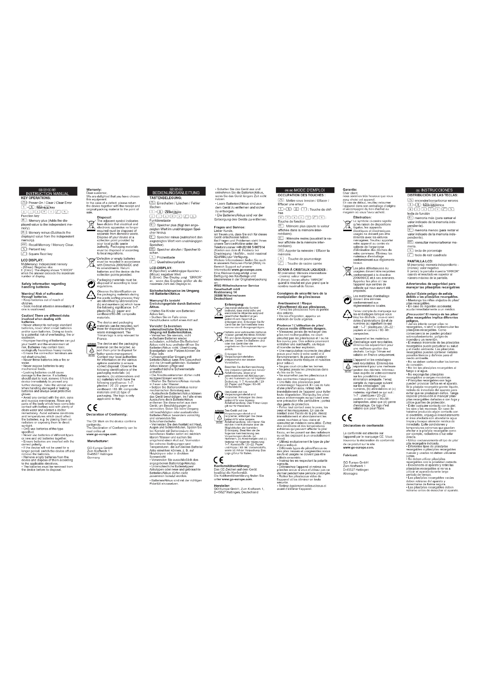 - Schalten Sie das Gerät aus und entnehmen Sie die Batterien/Akkus, wenn Sie das Gerät längere Zeit nicht nutzen. Garantie: Cher client, nous sommes très heureux que vous ayez choisi cet appareil. En cas de défaut, veuillez retourner l’appareil dans son emballage d’origine et accompagné du bon d’achat au magasin où vous l’avez acheté. Élimination: Le symbole ci-contre signifie qu'en raison de dispositions légales, les appareils électriques et électroniques usagés ne doivent pas être éliminés avec les ordures ménagères. Veuillez apporter votre appareil au centre de collecte de l'organisme d'élimination des déchets de votre commune. Éliminez les matériaux d'emballage conformément aux règlements locaux. Les piles défectueuses ou usagées doivent être recyclées conformément à la directive 2006/66/CE et à ses avenants. Apportez les piles et / ou l'appareil aux centres de collecte qui vous auront été proposés. Les matériaux d'emballage doivent être éliminés conformément aux réglementations locales. Tenez compte du marquage sur les emballages lorsque vous triez les déchets ; ceux-ci sont dotés d'abréviations (b) et de numéros (a) signifiant ce qui suit : 1–7 : plastiques / 20–22 : papiers et cartons / 80–98 : composites. L'appareil et les matériaux d'emballage sont recyclables, éliminez-les séparément pour une meilleure gestion des déchets. Le logo Triman est valable en France uniquement. L'appareil et les emballages sont recyclables. Éliminez-les séparément pour une meilleure gestion des déchets. Informez- vous auprès de votre commune sur les possibilités d'une élimination adéquate. Tenez compte du marquage suivant sur les emballages : (a) numéros, (b) abréviations et (c) matériau signifiant ce qui suit : 1–7 : plastiques / 20–22 : papiers et cartons / 80–98 : composites, ainsi que (d) genre d'emballage. Ce logo n'est valable que pour l'Italie. Déclaration de conformité: La conformité est attestée sur l'appareil par le marquage CE. Vous trouverez la déclaration de conformité de ce produit sur le site www.go-europe.com. Fabricant: GO Europe GmbH Zum Kraftwerk 1 D-45527 Hattingen Allemagne INSTRUCCIONES DISTRIBUCIÓN DE LAS TECLAS: : encender/borrar/borrar errores ~ , , : tecla numérica