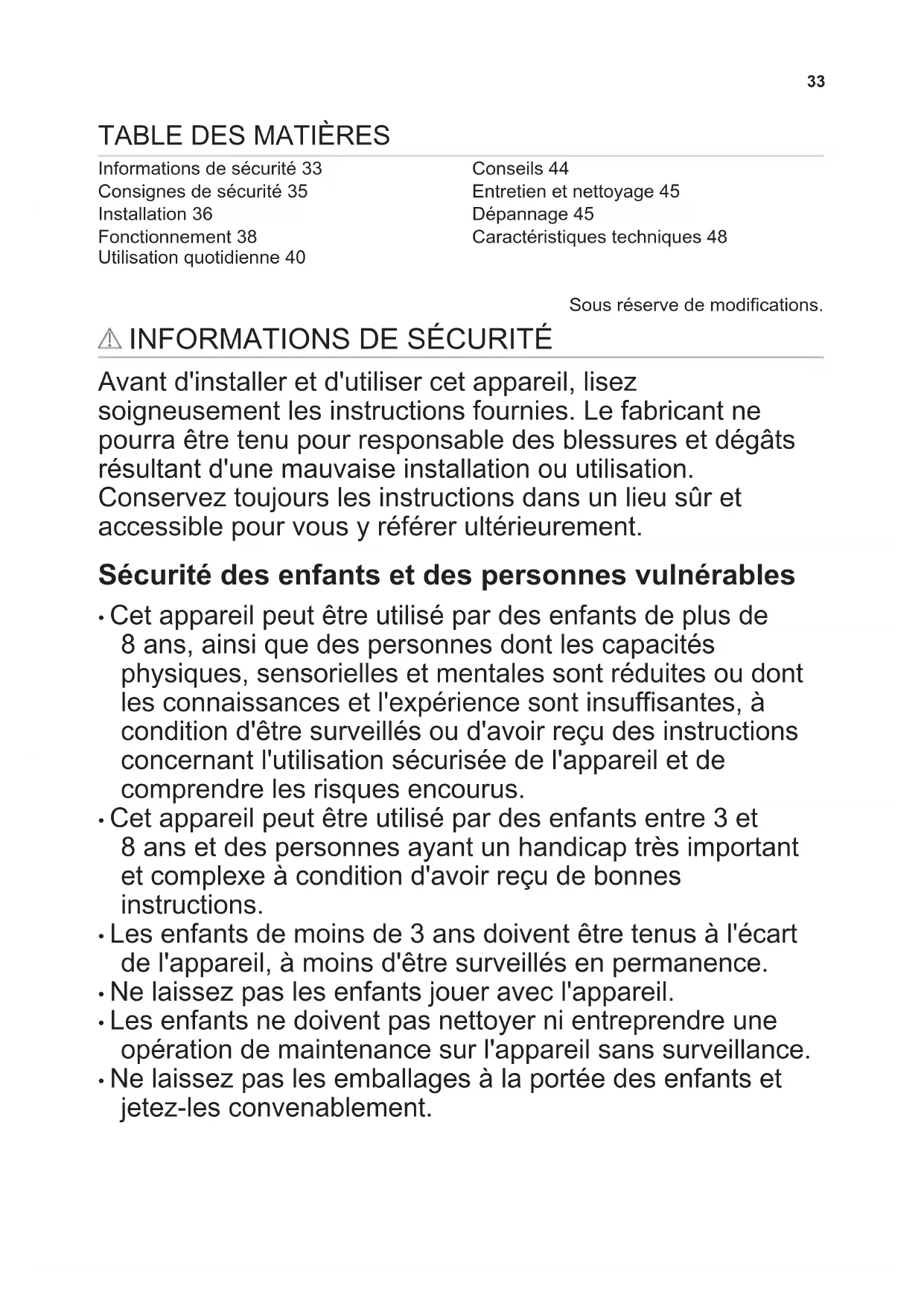 Informations de sécurité 33 Consignes de sécurité 35 Installation 36 Fonctionnement 38 Utilisation quotidienne 40 Conseils 44 Entretien et nettoyage 45 Dépannage 45 Caractéristiques techniques 48 Sous réserve de modifications.