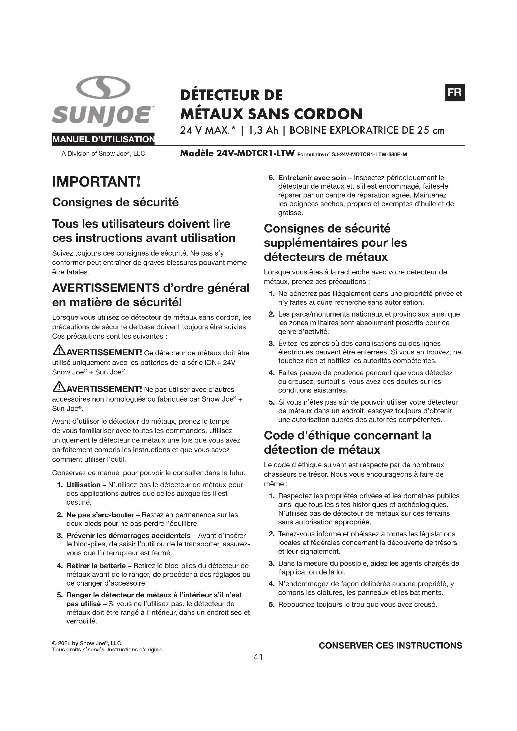 IMPORTANT! Consignes de sécurité Tous les utilisateurs doivent lire ces instructions avant utilisation Suivez toujours ces consignes de sécurité. Ne pas s’y conformer peut entraîner de graves blessures pouvant même être fatales. AVERTISSEMENTS d’ordre général en matière de sécurité! Lorsque vous utilisez ce détecteur de métaux sans cordon, les précautions de sécurité de base doivent toujours être suivies. Ces précautions sont les suivantes : mAVERTISSEMENT! Ce détecteur de métaux doit être utilisé uniquement avec les batteries de la série iON+ 24V Snow Joe