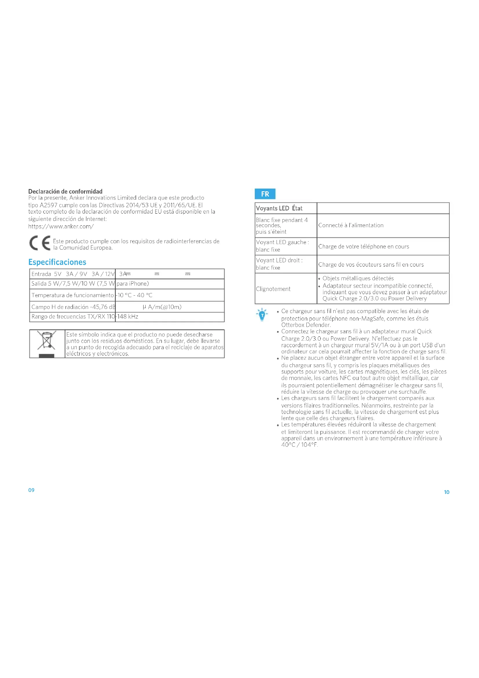 approuvés par la partie responsable de la conformité pourraient entraîner une annulation de l'autorisation d'utilisation de l'équipement. REMARQUE : cet appareil a été testé et déclaré conforme aux restrictions relatives à un appareil numérique de Classe B, en application de la section 15 du règlement de la FCC. Ces restrictions sont désignées afin de fournir une protection raisonnable contre des interférences nuisibles dans une installation résidentielle. Cet appareil génère, utilise et peut émettre des fréquences radio qui peuvent causer des interférences nuisibles aux radiocommunications si l’appareil n’est pas installé et utilisé conformément aux instructions. Cependant, il n'est nullement garanti que ces interférences seproduiront dans une installation particulière.Si cet appareil provoque des interférences nuisibles à la réception de la radio ou de la télévision, ce qui peut être déterminé en mettant en route l'appareil et en l'arrêtant, il est recommandé d'essayer de corriger les interférences en prenant l'une ou plusieurs des mesures suivantes : (1) réorienter ou déplacer l'antenne de réception , (2) éloigner davantage l'appareil du récepteur ; (3) brancher l'appareil à une prise sur un circuit différent de celui auquel le récepteur est connecté ; (4) consulter le revendeur ou un technicien expérimenté en radio/télévision pour obtenir une assistance. Déclaration sur l'exposition aux radiations Cet équipement est conforme aux limites FCC d'exposition aux rayonnements définies pour un environnement non contrôlé. Cet équipement doit être installé et utilisé avec une distance minimale de 20 cm entre le radiateur et votre corps. Nom du produit : Anker 533 Magnetic Wireless Charger (3-in-1 Stand) Modèle : A2597 L'importateur suivant est la partie responsable (pour les questions relatives au règlement FCC uniquement). Nom de la société : Fantasia Trading LLC Adresse : 5350 Ontario Mills Pkwy, Suite 100, Ontario, CA 91764 Téléphone : +1 800 988 7973 Déclaration d'Industrie Canada Cet appareil est conforme à la orme RSS-216 d'Industrie Canada. Son utilisation est sujette auxconditions voulant que cet appareil ne cause aucune interférence nuisible. RSS-Gen numéro 5 mars 2019 Cet appareil contient des émetteurs / récepteurs exemptés de licence conformes aux RSS (RSS) d'Innovation, Sciences et Développement économique Canada. Le fonctionnement est soumis aux deux conditions suivantes: (1) Cet appareil ne doit pas causer d'interférences. (2) Cet appareil doit accepter toutes les interférences, y compris celles susceptibles de provoquer un fonctionnement indésirable de l'appareil. Tout changement ou modification non expressément approuvé par la partie responsable de la conformité pourrait annuler l'autorité de l'utilisateur à utiliser l'équipement.14