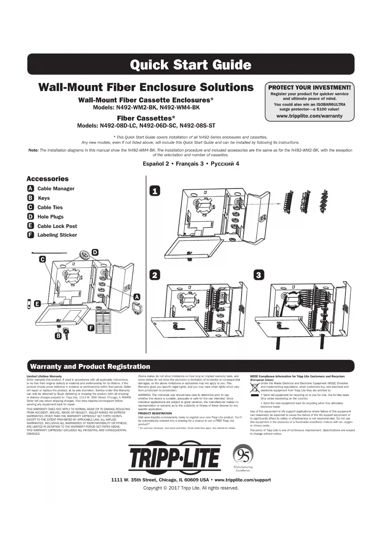 Guide de démarrage rapide Solutions pour boîtiers pour fibres muraux Boîtiers pour cassette à fibres muraux* Modèles : N492-WM2-BK, N492-WM4-BK Cassettes à fibres* Modèles : N492-08D-LC, N492-06D-SC, N492-08S-ST 1111 W. 35th Street, Chicago, IL 60609 USA • www.tripplite.com/supportDroits d’auteur © 2017 Tripp Lite. Tous droits réservés. Garantie Garantie à vie limitéeLe vendeur garantit que ce produit, s’il est utilisé conformément à toutes les instructions applicables, est exempt de tous défauts de matériaux et de fabrication pendant toute sa durée de vie. Si le produit s’avère défectueux en raison d’un vice de matière ou de fabrication au cours de cette période, le vendeur s’engage à réparer ou remplacer le produit, à sa seule discrétion. Le service sous cette garantie ne peut être obtenu par l’acheteur qu’en livrant ou en expédiant le produit (avec tous les frais d’expédition ou de livraison prépayés) à : Tripp Lite, 1111 W. 35th Street, Chicago, IL 60609. Le vendeur paiera les frais d’expédition de retour. Visiter www.tripplite.com/support avant d’envoyer de l’équipement pour réparation.CETTE GARANTIE NE S’APPLIQUE PAS À L’USURE NORMALE OU AUX DOMMAGES RÉSULTANT D’UNE MAUVAISE UTILISATION, D’UN ABUS OU D’UNE NÉGLIGENCE. LE VENDEUR NE DONNE AUCUNE GARANTIE EXPRESSE AUTRE QUE LA GARANTIE EXPRESSÉMENT DÉCRITE DANS LE PRÉSENT DOCUMENT. SAUF DANS LA MESURE INTERDITE PAR LA LOI APPLICABLE, TOUTE GARANTIE IMPLICITE, Y COMPRIS TOUTES LES GARANTIES DE QUALITÉ MARCHANDE OU D’ADAPTATION, SONT LIMITÉES À LA PÉRIODE DE GARANTIE CI-DESSUS; CETTE GARANTIE EXCLUT EXPRESSÉMENT TOUS DOMMAGES DIRECTS ET INDIRECTS. (Certains États ne permettent pas de limitations sur la durée d’une garantie implicite, et certains États ne permettent pas l’exclusion ou la limitation des dommages fortuits ou consécutifs, de sorte que les limitations ou exclusions susmentionnées peuvent ne pas s’appliquer à vous. Cette garantie vous donne des droits légaux spécifiques, et vous pouvez avoir d’autres droits qui varient selon le territoire.)AVERTISSEMENT : L’utilisateur individuel doit prendre soin de déterminer avant l’utilisation si cet appareil est approprié, adéquat et sûr pour l’usage prévu. Puisque les utilisations individuelles sont sujettes à des variations importantes, le fabricant ne fait aucune déclaration ou garantie quant à l’aptitude ou l’adaptation de ces dispositifs pour une application spécifique.Renseignements sur la conformité à la directive DEEE pour les clients de Tripp Lite et les recycleurs (Union européenne)En vertu de la directive et des règlements d’application relatifs aux déchets d’équipements électriques et électroniques (DEEE), lorsque des clients achètent de l’équipement électrique et électronique neuf de Tripp Lite, ils ont droit :• D’envoyer l’équipement usagé au recyclage pourvu qu’il remplace un équipement équivalent (cela varie selon les pays)• De retourner le nouvel équipement afin qu’il soit recyclé à la fin de sa vie utile.Il n’est pas recommandé d’utiliser cet équipement pour des appareils de survie où une défaillance de cet équipement peut, selon toute vraisemblance, entraîner la défaillance de l’appareil de maintien de la vie ou affecter de façon majeure sa sécurité ou son efficacité.La politique de Tripp Lite en est une d’amélioration continue. Les caractéristiques techniques sont sujettes à changement sans préavis.* Ce guide de démarrage rapide couvre l’installation de tous les boîtiers et toutes les cassettes de série N492. Tous les nouveaux modèles, même s’ils ne sont pas mentionnés ci-dessus, incluront ce guide de démarrage rapide et peuvent être installés en suivant ses instructions. Remarque : Les diagrammes d’installation dans ce manuel installation illustrent le N492-WM4-BK. La procédure d’installation et les accessoires inclus sont les mêmes que pour N492-WM2-BK, à l’exception de l’orientation et du nombre de cassettes. English 1 • Español 2 • Русский 4