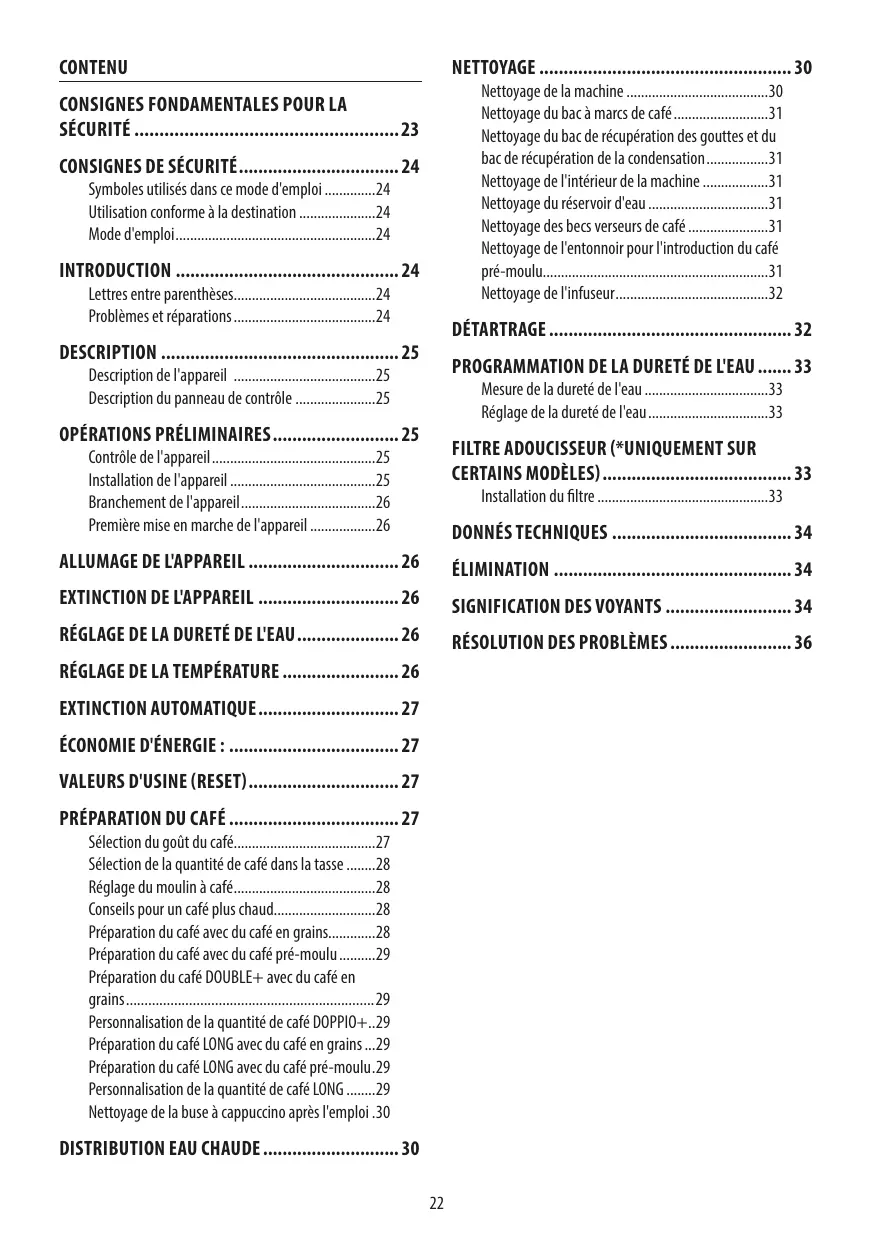 RÉGLAGE DE LA TEMPÉRATURE 26 EXTINCTION AUTOMATIQUE 27 ÉCONOMIE D'ÉNERGIE : 27 VALEURS D'USINE (RESET) 27 PRÉPARATION DU CAFÉ 27 Sélection du goût du café27 Sélection de la quantité de café dans la tasse28 Réglage du moulin à café28 Conseils pour un café plus chaud28 Préparation du café avec du café en grains28 Préparation du café avec du café pré-moulu29 Préparation du café DOUBLE+ avec du café en grains29 Personnalisation de la quantité de café DOPPIO+...29 Préparation du café LONG avec du café en grains....29 Préparation du café LONG avec du café pré-moulu..29 Personnalisation de la quantité de café LONG29 Nettoyage de la buse à cappuccino après l'emploi..30