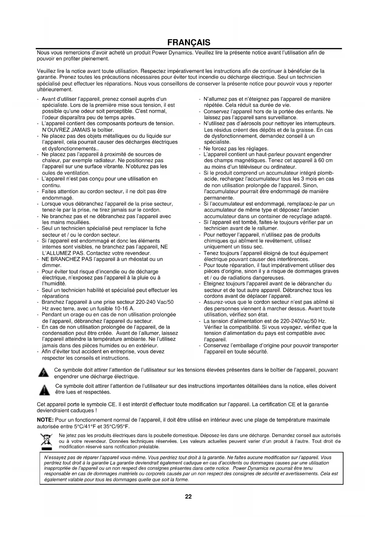 FRANÇAIS Nous vous remercions d’avoir acheté un produit Power Dynamics. Veuillez lire la présente notice avant l’utilisation afin de pouvoir en profiter pleinement. Veuillez lire la notice avant toute utilisation. Respectez impérativement les instructions afin de continuer à bénéficier de la garantie. Prenez toutes les précautions nécessaires pour éviter tout incendie ou décharge électrique. Seul un technicien spécialisé peut effectuer les réparations. Nous vous conseillons de conserver la présente notice pour pouvoir vous y reporter ultérieurement. - Avant d’utiliser l’appareil, prenez conseil auprès d’un spécialiste. Lors de la première mise sous tension, il est possible qu’une odeur soit perceptible. C’est normal, l’odeur disparaîtra peu de temps après. - L’appareil contient des composants porteurs de tension. N’OUVREZ JAMAIS le boîtier. - Ne placez pas des objets métalliques ou du liquide sur l’appareil, cela pourrait causer des décharges électriques et dysfonctionnements.. - Ne placez pas l’appareil à proximité de sources de chaleur, par exemple radiateur. Ne positionnez pas l’appareil sur une surface vibrante. N’obturez pas les ouïes de ventilation. - L’appareil n’est pas conçu pour une utilisation en continu. - Faites attention au cordon secteur, il ne doit pas être endommagé. - Lorsque vous débranchez l’appareil de la prise secteur, tenez-le par la prise, ne tirez jamais sur le cordon. - Ne branchez pas et ne débranchez pas l’appareil avec les mains mouillées. - Seul un technicien spécialisé peut remplacer la fiche secteur et / ou le cordon secteur. - Si l’appareil est endommagé et donc les éléments internes sont visibles, ne branchez pas l’appareil, NE L’ALLUMEZ PAS. Contactez votre revendeur. - NE BRANCHEZ PAS l’appareil à un rhéostat ou un dimmer. - Pour éviter tout risque d’incendie ou de décharge électrique, n’exposez pas l’appareil à la pluie ou à l’humidité. - Seul un technicien habilité et spécialisé peut effectuer les réparations - Branchez l’appareil à une prise secteur 220-240 Vac/50 Hz avec terre, avec un fusible 10-16 A. - Pendant un orage ou en cas de non utilisation prolongée de l’appareil, débranchez l’appareil du secteur. - En cas de non utilisation prolongée de l’appareil, de la condensation peut être créée. Avant de l’allumer, laissez l’appareil atteindre la température ambiante. Ne l’utilisez jamais dans des pièces humides ou en extérieur. - Afin d’éviter tout accident en entreprise, vous devez respecter les conseils et instructions. - N’allumez pas et n’éteignez pas l’appareil de manière répétée. Cela réduit sa durée de vie. - Conservez l’appareil hors de la portée des enfants. Ne laissez pas l’appareil sans surveillance. - N’utilisez pas d’aérosols pour nettoyer les interrupteurs. Les résidus créent des dépôts et de la graisse. En cas de dysfonctionnement, demandez conseil à un spécialiste. - Ne forcez pas les réglages. - L’appareil contient un haut-parleur pouvant engendrer des champs magnétiques. Tenez cet appareil à 60 cm au moins d’un téléviseur ou ordinateur. - Si le produit comprend un accumulateur intégré plomb- acide, rechargez l'accumulateur tous les 3 mois en cas de non utilisation prolongée de l'appareil. Sinon, l'accumulateur pourrait être endommagé de manière permanente. - Si l’accumulateur est endommagé, remplacez-le par un accumulateur de même type et déposez l’ancien accumulateur dans un container de recyclage adapté. - Si l’appareil est tombé, faites-le toujours vérifier par un technicien avant de le rallumer. - Pour nettoyer l’appareil, n’utilisez pas de produits chimiques qui abîment le revêtement, utilisez uniquement un tissu sec. - Tenez toujours l’appareil éloigné de tout équipement électrique pouvant causer des interférences. - Pour toute réparation, il faut impérativement utiliser des pièces d’origine, sinon il y a risque de dommages graves et / ou de radiations dangereuses. - Eteignez toujours l’appareil avant de le débrancher du secteur et de tout autre appareil. Débranchez tous les cordons avant de déplacer l’appareil. - Assurez-vous que le cordon secteur n’est pas abîmé si des personnes viennent à marcher dessus. Avant toute utilisation, vérifiez son état. - La tension d’alimentation est de 220-240Vac/50 Hz. Vérifiez la compatibilité. Si vous voyagez, vérifiez que la tension d’alimentation du pays est compatible avec l’appareil. - Conservez l’emballage d’origine pour pouvoir transporter l’appareil en toute sécurité. Ce symbole doit attirer l’attention de l’utilisateur sur les tensions élevées présentes dans le boîtier de l’appareil, pouvant engendrer une décharge électrique. Ce symbole doit attirer l’attention de l’utilisateur sur des instructions importantes détaillées dans la notice, elles doivent être lues et respectées. Cet appareil porte le symbole CE. Il est interdit d’effectuer toute modification sur l’appareil. La certification CE et la garantie deviendraient caduques ! NOTE: Pour un fonctionnement normal de l’appareil, il doit être utilisé en intérieur avec une plage de température maximale autorisée entre 5°C/41°F et 35°C/95°F. Ne jetez pas les produits électriques dans la poubelle domestique. Déposez-les dans une décharge. Demandez conseil aux autorisés ou à votre revendeur. Données techniques réservées. Les valeurs actuelles peuvent varier d’un produit à l’autre. Tout droit de modification réservé sans notification préalable. N’essayez pas de réparer l’appareil vous-même. Vous perdriez tout droit à la garantie. Ne faites aucune modification sur l’appareil. Vous perdriez tout droit à la garantie La garantie deviendrait également caduque en cas d’accidents ou dommages causes par une utilisation inappropriée de l’appareil ou