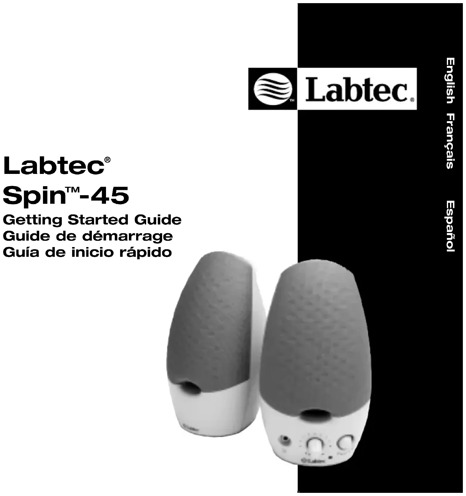 - Déconnectez-les de l’alimentation secteur en retirant la fiche de la prise murale. La prise d’alimentation doit se trouver à proximité de l’équipement et doit être facilement accessible. ATTENTION: tout matériel électrique présente de graves risques si laissé à la portée des enfants. L’utilisation de ce produit doit s’effectuer sous la supervision constante d’un adulte. Veillez à ce que personne n’essaie d’ouvrir les appareils électriques et à ce que les enfants ne manipulent pas les câbles. Garantie du produit Garantie limitée. Labtech certifie que les produits matériels accompagnant cette documentation sont exempts de tout défaut de fabrication et sont garantis pendant une période d’un (1) an à compter de la date d'achat. La garantie Labtec est limitée à l'acheteur initial et ne peut faire l'objet d'un transfert. La présente garantie vous confère certains droits légaux spécifiques. Vous pouvez détenir d'autres droits selon les lois locales. Recours. En cas de rupture de garantie, l’intégralité de la responsabilité de Labtec et votre recours exclusif consisteront, au choix de Labtec, à: (a) réparer ou remplacer le matériel, sous réserve que le matériel soit renvoyé au point de vente ou à tout autre lieu indiqué par Labtec, accompagné d’une copie du justificatif d’achat, ou (b) rembourser le prix d’achat. Tout matériel remplacé sera garanti jusqu'à échéance de la garantie d'origine ou pour une durée de trente (30) jours, selon la période la plus longue. Ces recours sont nuls si la défaillance du matériel est due à un accident, à un mauvais traitement ou à une utilisation inappropriée. GARANTIE LIMITEE. LES GARANTIES PREVUES DANS CET ACCORD REMPLACENT TOUTES LES AUTRES GARANTIES. LABTEC ET SES FOURNISSEURS DECLINENT EXPRESSEMENT TOUTE AUTRE GARANTIE, Y COMPRIS SANS QUE CETTE ENUMERATION SOIT LIMITATIVE, TOUTE GARANTIE IMPLICITE DU CARACTERE ADEQUAT POUR LA COMMERCIALISATION OU UN USAGE PARTICULIER AINSI QUE TOUTE GARANTIE DE NON VIOLATION DES DROITS DE TIERS A L'EGARD DU MATERIEL. AUCUN DISTRIBUTEUR, AGENT OU EMPLOYE DE LABTEC N'EST AUTORISE A EFFECTUER DES MODIFICATIONS, DES EXTENSIONS OU DES AJOUTS DANS CETTE GARANTIE. Certaines juridictions ne reconnaissent pas les limitations de durée des garanties implicites; il est donc possible que la limitation susmentionnée ne s’applique pas à votre cas. LIMITES DE RESPONSABILITE. EN AUCUN CAS LABTEC OU SES FOURNISSEURS NE SAURAIENT ETRE TENUS RESPONSABLES A L'EGARD DES COÛTS D'APPROVISIONNEMENT EN PRODUITS OU SERVICES DE REMPLACEMENT, DU MANQUE A GAGNER, DE LA PERTE D'INFORMATIONS OU DE DONNEES, OU DE TOUT AUTRE DOMMAGE PARTICULIER, INDIRECT, CONSECUTIF OU ACCIDENTEL DECOULANT DE QUELQUE FAÇON QUE CE SOIT DE LA VENTE, DE L'UTILISATION OU DE L'IMPOSSIBILITE D'UTILISER UN PRODUIT OU UN SERVICE LABTEC, MEME SI LABTEC A ETE INFORME DE L'EVENTUALITE DE TELS DOMMAGES. LA RESPONSABILITE DE LABTEC ET DE SES FOURNISSEURS NE SAURAIT EN AUCUN CAS DEPASSER LE MONTANT EFFECTIVEMENT DEBOURSE POUR L'ACQUISITION DES PRODUITS OU SERVICES LABTEC MIS EN CAUSE. Certaines juridictions n’autorisent pas l’exclusion ou la limitation des dommages accessoires ou consécutifs; il est donc possible que la limitation ou l’exclusion susmentionnée ne s’applique pas à votre cas. Les limites susmentionnées ne s'appliqueront pas en cas de préjudice corporel lorsque et dans la mesure où la loi en vigueur prévoit l'existence de cette responsabilité.English Français Español El sistema de altavoces Spin™-45 ofrece la característica Plug and Play para su uso con equipos PC y la mayoría de dispositivos musicales portátiles. ¡Conéctelo y disfrute! Instalación Conecte la clavija verde al conector Audio-Out del PC. Conecte el cable de CA a la toma de alimentación. Por su propia seguridad y la del equipo, tome siempre las siguientes precauciones: