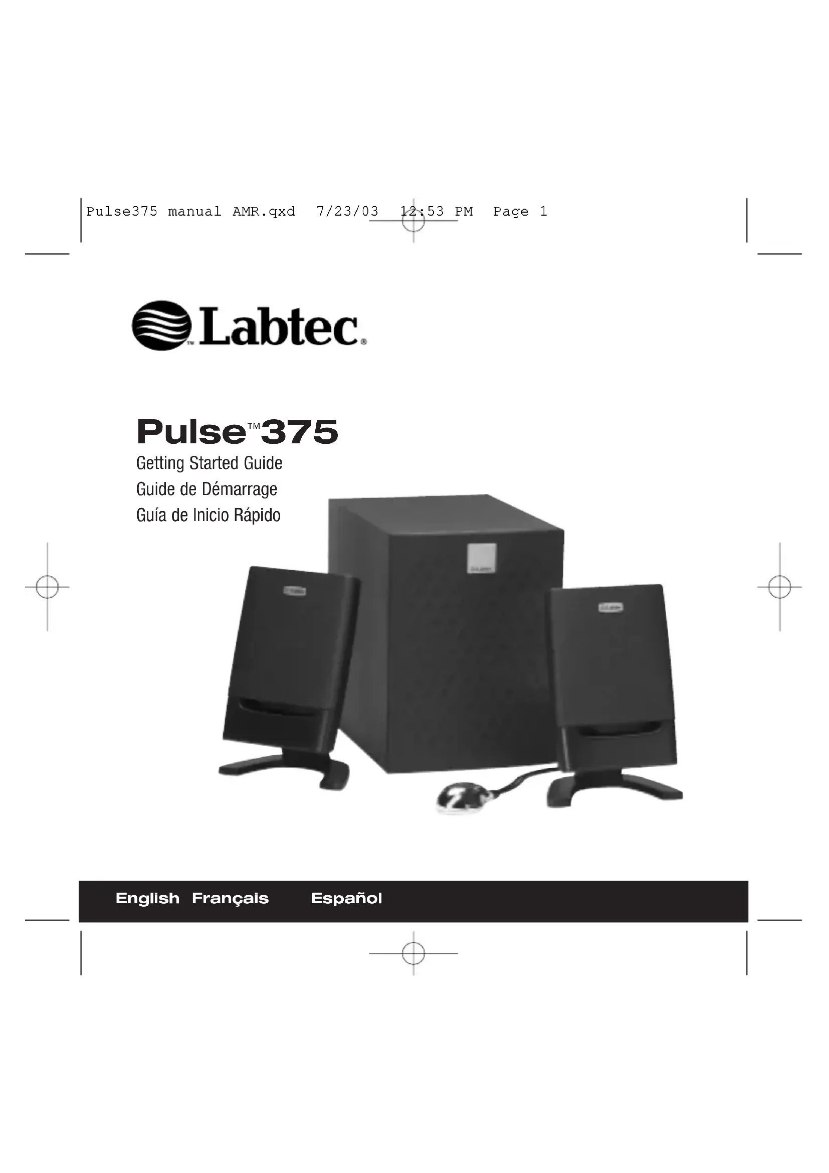 - Dimensions des haut-parleurs: Haut-parleurs satellites: 17,8 cm (H) X 10,2 cm (L) X 5,7 cm (P) Subwoofer: 20,3 cm (H) X 14,6 cm (L) X 21 cm (P) Français Français Garantie du produit Garantie limitée. Labtech certifie que les produits matériels accompagnant cette documentation sont exempts de tout défaut de fabrication et sont garantis pendant une période d’un (1) an à compter de la date d'achat. La garantie Labtec est limitée à l'acheteur initial et ne peut faire l'objet d'un transfert. La présente garantie vous confère certains droits légaux spécifiques. Vous pouvez détenir d'autres droits selon les lois locales. Recours. En cas de rupture de garantie, l’intégralité de la responsabilité de Labtec et votre recours exclusif consisteront, au choix de Labtec, à: (a) réparer ou remplacer le matériel, sous réserve que le matériel soit renvoyé au point de vente ou à tout autre lieu indiqué par Labtec, accompagné d’une copie du justificatif d’achat, ou (b) rembourser le prix d’achat. Tout matériel remplacé sera garanti jusqu'à échéance de la garantie d'origine ou pour une durée de trente (30) jours, selon la période la plus longue. Ces recours sont nuls si la défaillance du matériel est due à un accident, à un mauvais traitement ou à une utilisation inappropriée. GARANTIE LIMITEE. LES GARANTIES PREVUES DANS CET ACCORD REMPLACENT TOUTES LES AUTRES GARANTIES. LABTEC ET SES FOURNISSEURS DECLINENT EXPRESSEMENT TOUTE AUTRE GARANTIE, Y COMPRIS SANS QUE CETTE ENUMERATION SOIT LIMITATIVE, TOUTE GARANTIE IMPLICITE DU CARACTERE ADEQUAT POUR LA COMMERCIALISATION OU UN USAGE PARTICULIER AINSI QUE TOUTE GARANTIE DE NON VIOLATION DES DROITS DE TIERS A L'EGARD DU MATERIEL. AUCUN DISTRIBUTEUR, AGENT OU EMPLOYE DE LABTEC N'EST AUTORISE A EFFECTUER DES MODIFICATIONS, DES EXTENSIONS OU DES AJOUTS DANS CETTE GARANTIE. Certaines juridictions ne reconnaissent pas les limitations de durée des garanties implicites; il est donc possible que la limitation susmentionnée ne s’applique pas à votre cas. LIMITES DE RESPONSABILITE. EN AUCUN CAS LABTEC OU SES FOURNISSEURS NE SAURAIENT ETRE TENUS RESPONSABLES A L'EGARD DES COÛTS D'APPROVISIONNEMENT EN PRODUITS OU SERVICES DE REMPLACEMENT, DU MANQUE A GAGNER, DE LA PERTE D'INFORMATIONS OU DE DONNEES, OU DE TOUT AUTRE DOMMAGE PARTICULIER, INDIRECT, CONSECUTIF OU ACCIDENTEL DECOULANT DE QUELQUE FAÇON QUE CE SOIT DE LA VENTE, DE L'UTILISATION OU DE L'IMPOSSIBILITE D'UTILISER UN PRODUIT OU UN SERVICE LABTEC, MEME SI LABTEC A ETE INFORME DE L'EVENTUALITE DE TELS DOMMAGES. LA RESPONSABILITE DE LABTEC ET DE SES FOURNISSEURS NE SAURAIT EN AUCUN CAS DEPASSER LE MONTANT EFFECTIVEMENT DEBOURSE POUR L'ACQUISITION DES PRODUITS OU SERVICES LABTEC MIS EN CAUSE. Certaines juridictions n’autorisent pas l’exclusion ou la limitation des dommages accessoires ou consécutifs; il est donc possible que la limitation ou l’exclusion susmentionnée ne s’applique pas à votre cas. Les limites susmentionnées ne s'appliqueront pas en cas de préjudice corporel lorsque et dans la mesure où la loi en vigueur prévoit l'existence de cette responsabilité. © 2003 Labtec. Tous droits réservés. Labtec, le logo Labtec et les autres marques Labtec sont la propriété exclusive de Labtec et sont susceptibles d’être des marques déposées. Toutes les autres marques sont la propriété exclusive de leurs détenteurs respectifs. Labtec décline toute responsabilité en cas d’erreurs dans ce manuel. Les informations énoncées dans le présent document peuvent faire l’objet de modifications sans avis préalable. Pulse375 manual AMR.qxd 7/23/03 12:53 PM Page 8El sistema de altavoces Pulse