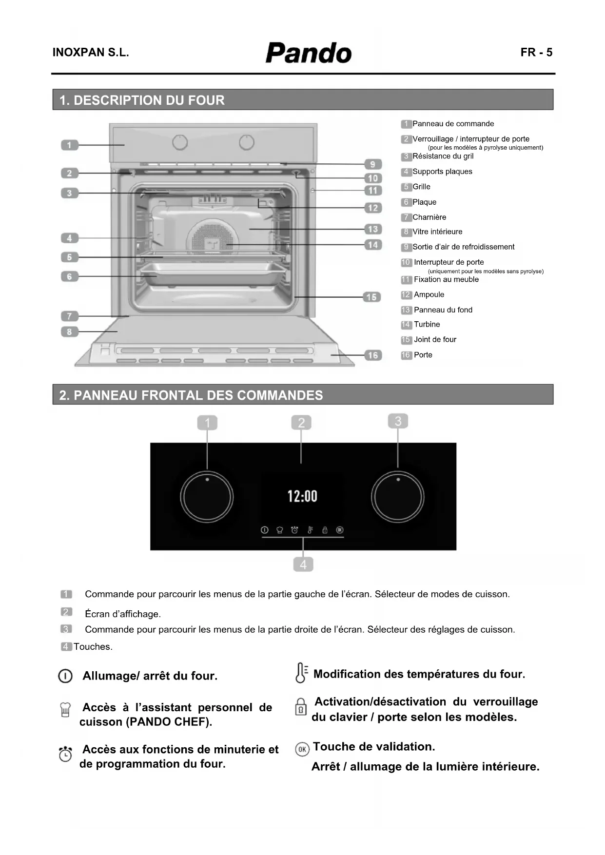 finition ou programmer une heure de fin de cuisson. Une fois ce temps écoulé, ces valeurs se fixent et ne pourront pas être modifiées. Pour modifier ces valeurs de cuisson, appuyez sur la touche et le four retourne sur l’écran de sélection.INOXPAN S.L. FR - 14