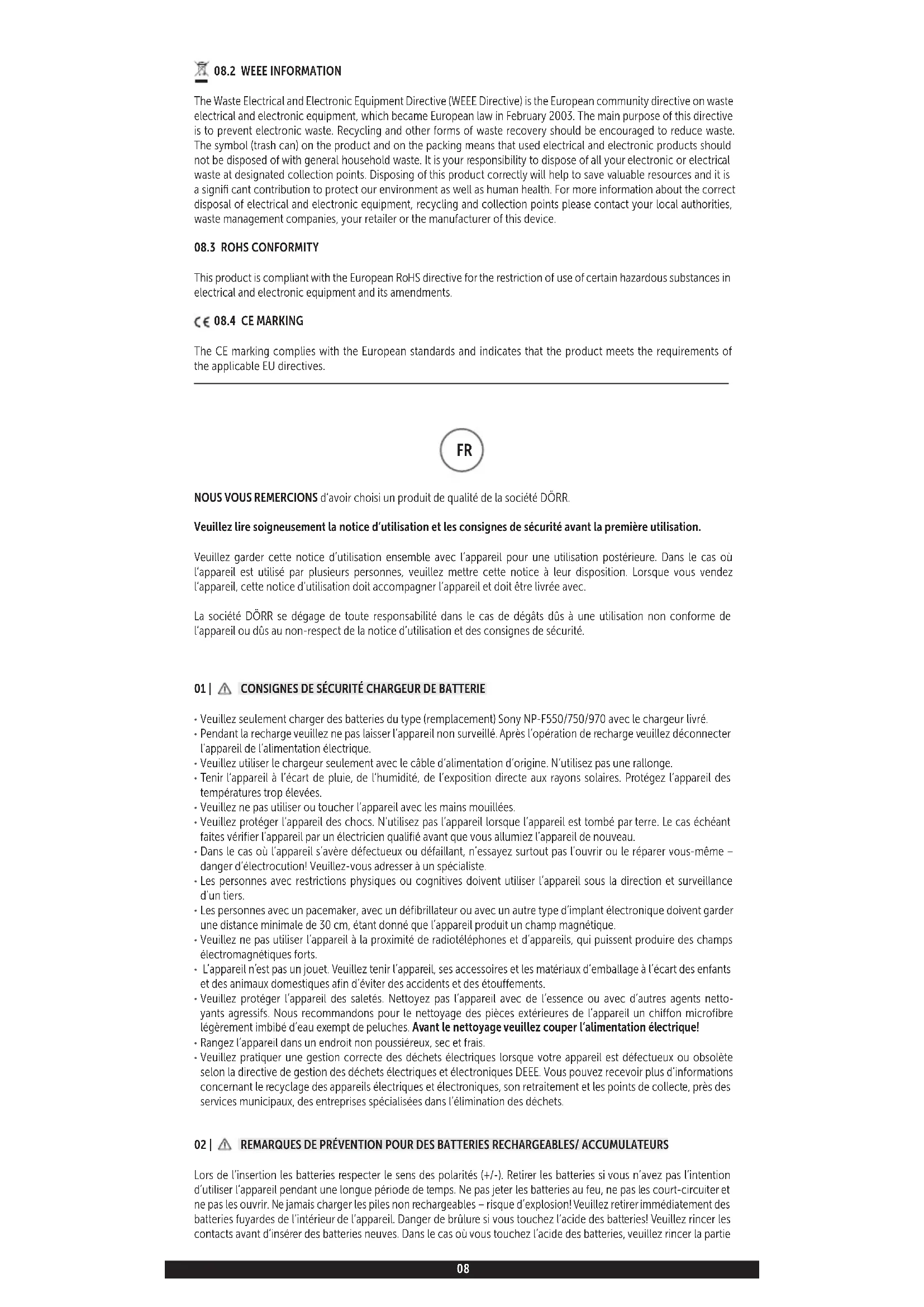 The CE marking complies with the European standards and indicates that the product meets the requirements of the applicable EU directives. NOUS VOUS REMERCIONS d’avoir choisi un produit de qualité de la société DÖRR. Veuillez lire soigneusement la notice d‘utilisation et les consignes de sécurité avant la première utilisation. Veuillez garder cette notice d’utilisation ensemble avec l’appareil pour une utilisation postérieure. Dans le cas où l’appareil est utilisé par plusieurs personnes, veuillez mettre cette notice à leur disposition. Lorsque vous vendez l’appareil, cette notice d’utilisation doit accompagner l’appareil et doit être livrée avec. La société DÖRR se dégage de toute responsabilité dans le cas de dégâts dûs à une utilisation non conforme de l’appareil ou dûs au non-respect de la notice d’utilisation et des consignes de sécurité. 01 | CONSIGNES DE SÉCURITÉ CHARGEUR DE BATTERIE