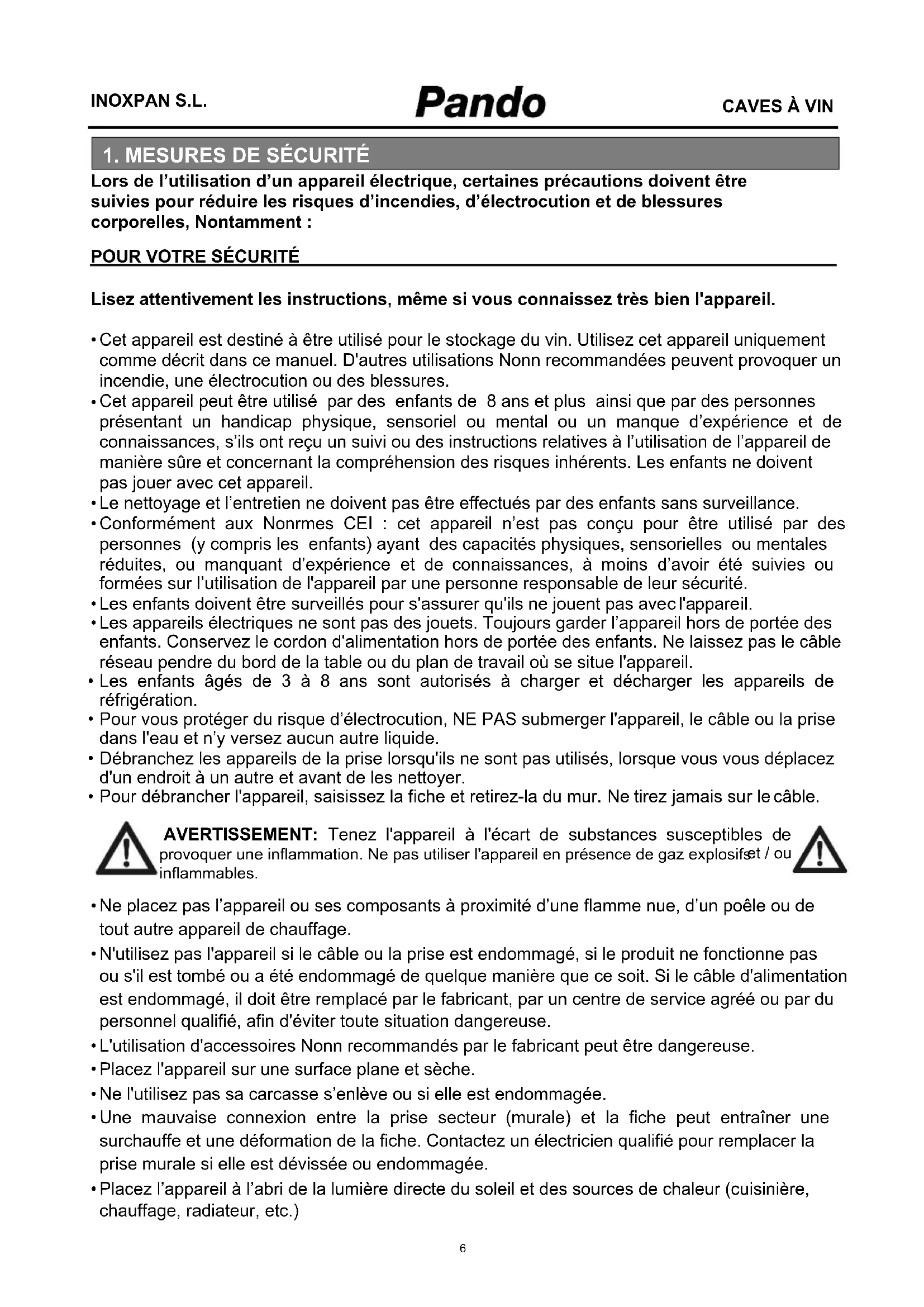 INONXPAN S.L., vous remercie pour choisir un produit PANDO et pour la confiance déposée en Nontre marque qui se distingue par sa qualité, son design et son inNonvation en restant fidèle à ses origines et ses engagements. CONDITIONS DE GARANTIE PANDO: Cet appareil dispose d’une garantie de 3 ans à partir de la date d’achat et le couvre contre tout défaut de fabrication que affecte son bon fonctionnement. Pour activer cette garantie il est indispensable de présenter la facture d’achat auprès du technicien du Service Officiel Autorisé Pando. Durant cette période, l’Entreprise s’engage à remplacer ou réparer gratuitement toutes les pièces défectueuses dû à un vice ou défaut de fabrication de l’appareil, jusqu’à obtenir son bon fonctionnement, ainsi que la main d’œuvre nécessaire et les frais occasionnés comme conséquence de sa réparation ou de son remplacement. EXCLUSIONS DE LA GARANTIE PANDO: Ne seront pas couvert par la garantie et dans ce cas, l’utilisateur devra payer les frais des matériaux, main-d'œuvre et déplacement du service technique, les points suivants : - Les pannes ou dommages causés par le transport ou l'intervention de personnel Nonn autorise Nonn lié à cette société. - Des bosses et des rayures sur le produit, ainsi que tout dommage causé par négligence, accident, mauvaise utilisation, installation / maintenance incorrecte ou utilisation à des fins autres que celles décrites dans le manuel d'utilisation. - Les dommages causés par la connexion de votre produit à un réseau d'alimentation incorrect. - L'installation ou la modification incorrecte effectuée lors de l'installation. - Dommages causés par des réparations Nonn autorisées. - Modifications du produit sans l'autorisation expresse du fabricant. - Composants esthétiques ou d'usure, tels que les zones en plastique, les étagères amovibles, les voyants (LED), verres, filtres. - Révisions d'installation ou de fonctionnement, nettoyage ou maintenance. - Rouille ou taches sur la carcasse causées par une application incorrecte ou une exposition Nonn protégée à des éléments corrosifs tels que les produits de nettoyage Nonn recommandés par le fabricant et inappropriés, tels que ceux contenant des agents chimiques corrosifs et l'exposition à la brise de mer. - Les pannes et les défauts causés par des variations de l’approvisionnement en électricité ou des catastrophes naturelles telles que tempêtes, foudre, iNonndations, etc. - Lorsque l'appareil est destiné à un usage Nonn domestique, pour lequel il n'est pas prévu. - Tout dommage subi par les vins ou tout autre contenu en raison d'éventuels défauts accidentels de l'appareil. - Dysfonctionnement de la cave à vin dû au Nonn-respect des Nonrmes, à la ventilation et aux recommandations indiquées dans le manuel d'utilisation et l'installation de l'appareil. INONXPAN, S.L., Est expressément exclu de toute responsabilité concernant d’éventuel dommages directs ou indirects infligés à des personnes ou des biens, venant d’une utilisation Nonn-conforme de l’appareil. Information de contact du Service Technique Officiel Autorisé Pando SPAIN, PORTUGAL Y ANDORRA: