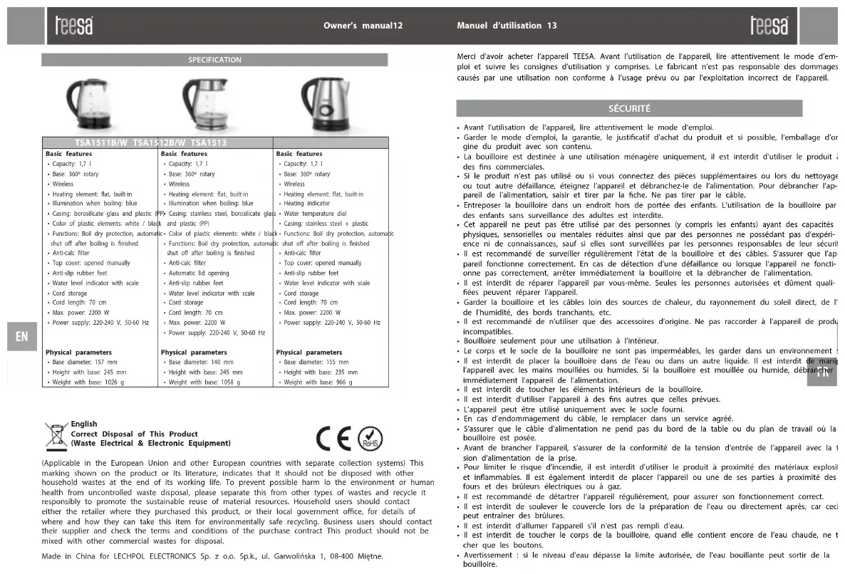 TSA1513 - Bouilloire Teesa - Notice d'utilisation et mode d'emploi gratuit