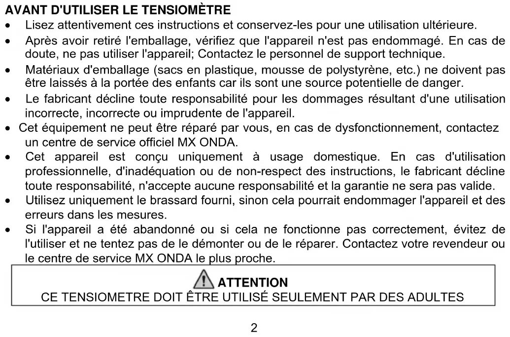 - Si l'appareil a été abandonné ou si cela ne fonctionne pas correctement, évitez de l'utiliser et ne tentez pas de le démonter ou de le réparer. Contactez votre revendeur ou le centre de service MX ONDA le plus proche. ATTENTION CE TENSIOMETRE DOIT ÊTRE UTILISÉ SEULEMENT PAR DES ADULTES3
