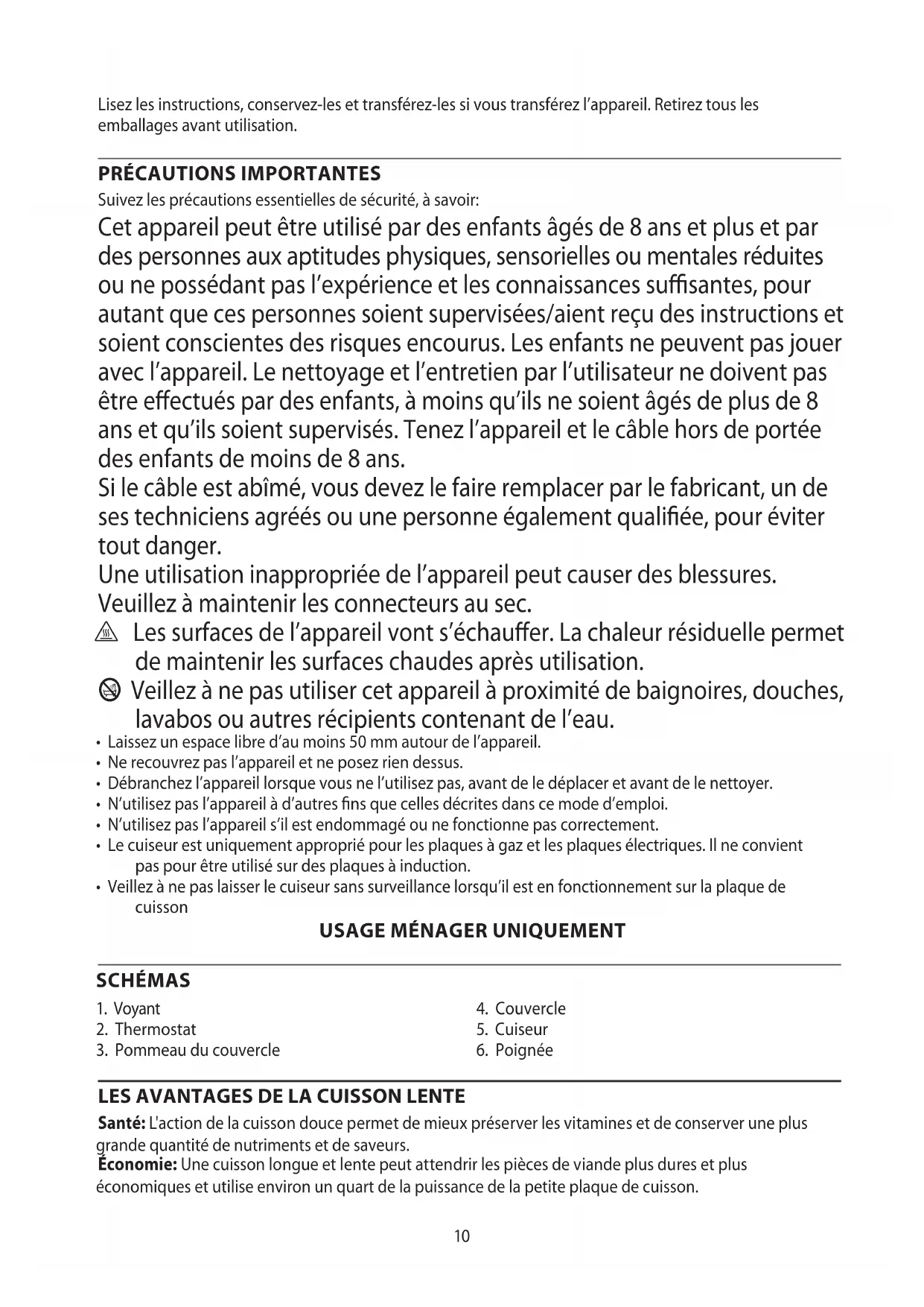 Santé: L'action de la cuisson douce permet de mieux préserver les vitamines et de conserver une plus grande quantité de nutriments et de saveurs. Économie: Une cuisson longue et lente peut attendrir les pièces de viande plus dures et plus économiques et utilise environ un quart de la puissance de la petite plaque de cuisson.11 Commodité: Préparez les ingrédients la veille, placez-les dans la mijoteuse avant de partir et un délicieux repas vous attendra à votre retour à la maison. THERMOSTAT 0 arrêt 1 Pour une cuisson lente traditionnelle. 2 Pour une “cuisson rapide”, en utilisant l'appareil comme un faitout électrique. O Pour maintenir les aliments chauds après la cuisson.