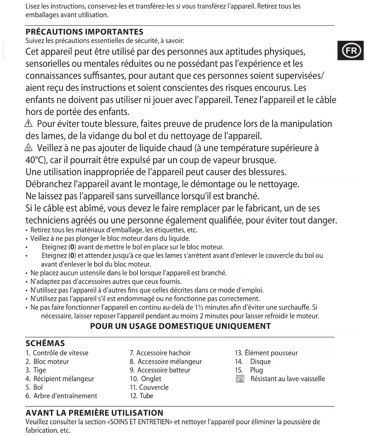| Maintenance et réparation | Nettoyage facile grâce aux pièces amovibles, bol et accessoires compatibles lave-vaisselle. Vérifier régulièrement l'état des accessoires et du moteur. |