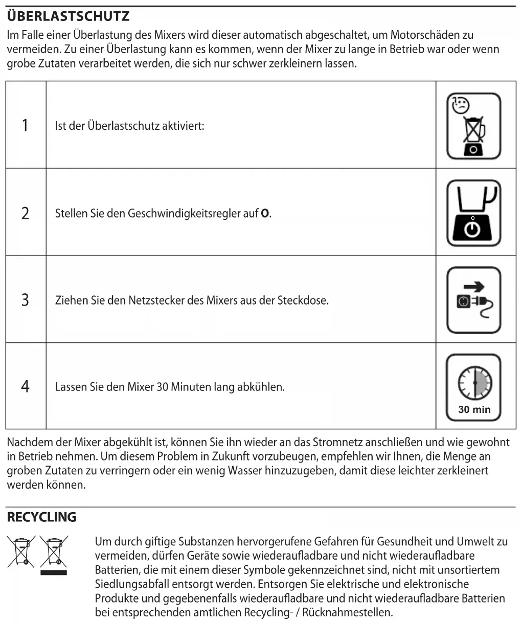Laissez votre mixeur refroidir pendant 30 minutes. 30 min Une fois que le mixeur a refroidi, vous pouvez le rebrancher et l’utiliser à nouveau normalement. Pour éviter que cela ne se reproduise, nous recommandons de réduire la quantité d›ingrédients plus épais ou d›ajouter un peu de liquide pour faciliter le mélange. RECYCLAGE