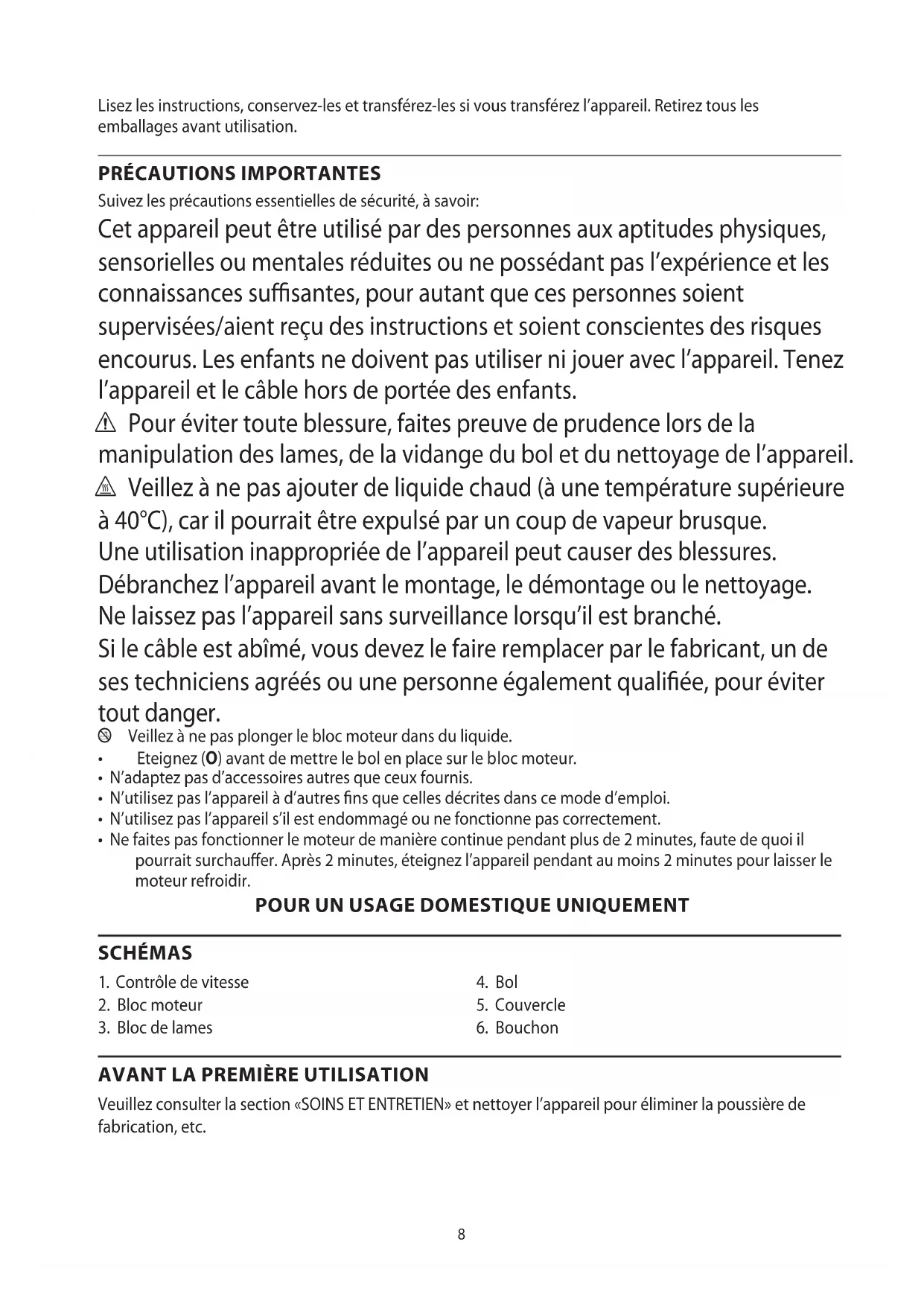 Suivez les précautions essentielles de sécurité, à savoir: Cet appareil peut être utilisé par des personnes aux aptitudes physiques, sensorielles ou mentales réduites ou ne possédant pas l’expérience et les connaissances susantes, pour autant que ces personnes soient supervisées/aient reçu des instructions et soient conscientes des risques encourus. Les enfants ne doivent pas utiliser ni jouer avec l’appareil. Tenez l’appareil et le câble hors de portée des enfants. c Pour éviter toute blessure, faites preuve de prudence lors de la manipulation des lames, de la vidange du bol et du nettoyage de l’appareil. h Veillez à ne pas ajouter de liquide chaud (à une température supérieure à 40°C), car il pourrait être expulsé par un coup de vapeur brusque. Une utilisation inappropriée de l’appareil peut causer des blessures. Débranchez l’appareil avant le montage, le démontage ou le nettoyage. Ne laissez pas l’appareil sans surveillance lorsqu’il est branché. Si le câble est abîmé, vous devez le faire remplacer par le fabricant, un de ses techniciens agréés ou une personne également qualiée, pour éviter tout danger. l Veillez à ne pas plonger le bloc moteur dans du liquide.