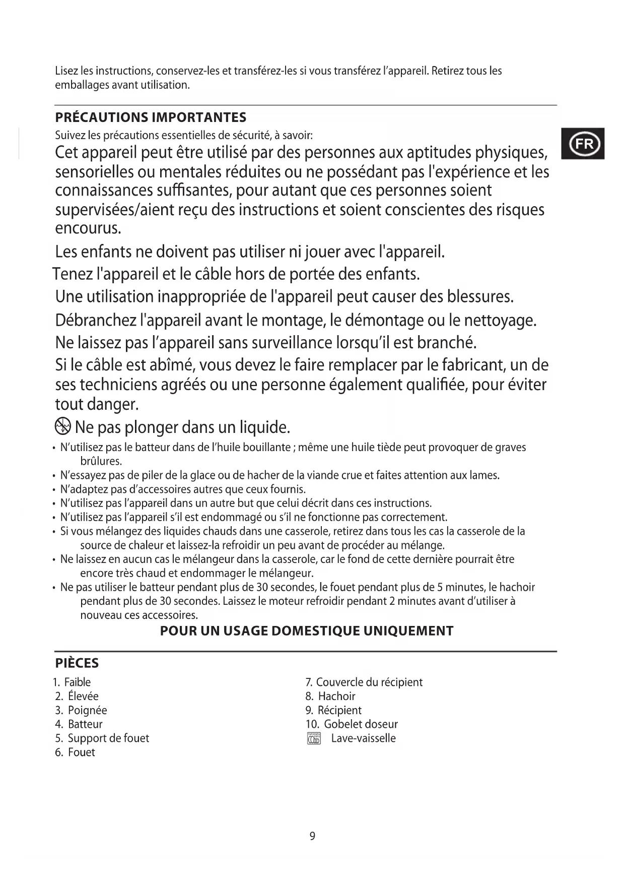 Suivez les précautions essentielles de sécurité, à savoir: Cet appareil peut être utilisé par des personnes aux aptitudes physiques, sensorielles ou mentales réduites ou ne possédant pas l'expérience et les connaissances suffisantes, pour autant que ces personnes soient supervisées/aient reçu des instructions et soient conscientes des risques encourus. Les enfants ne doivent pas utiliser ni jouer avec l'appareil. Tenez l'appareil et le câble hors de portée des enfants. Une utilisation inappropriée de l'appareil peut causer des blessures. Débranchez l'appareil avant le montage, le démontage ou le nettoyage. Ne laissez pas l’appareil sans surveillance lorsqu’il est branché. Si le câble est abîmé, vous devez le faire remplacer par le fabricant, un de ses techniciens agréés ou une personne également qualifiée, pour éviter tout danger. i Ne pas plonger dans un liquide.