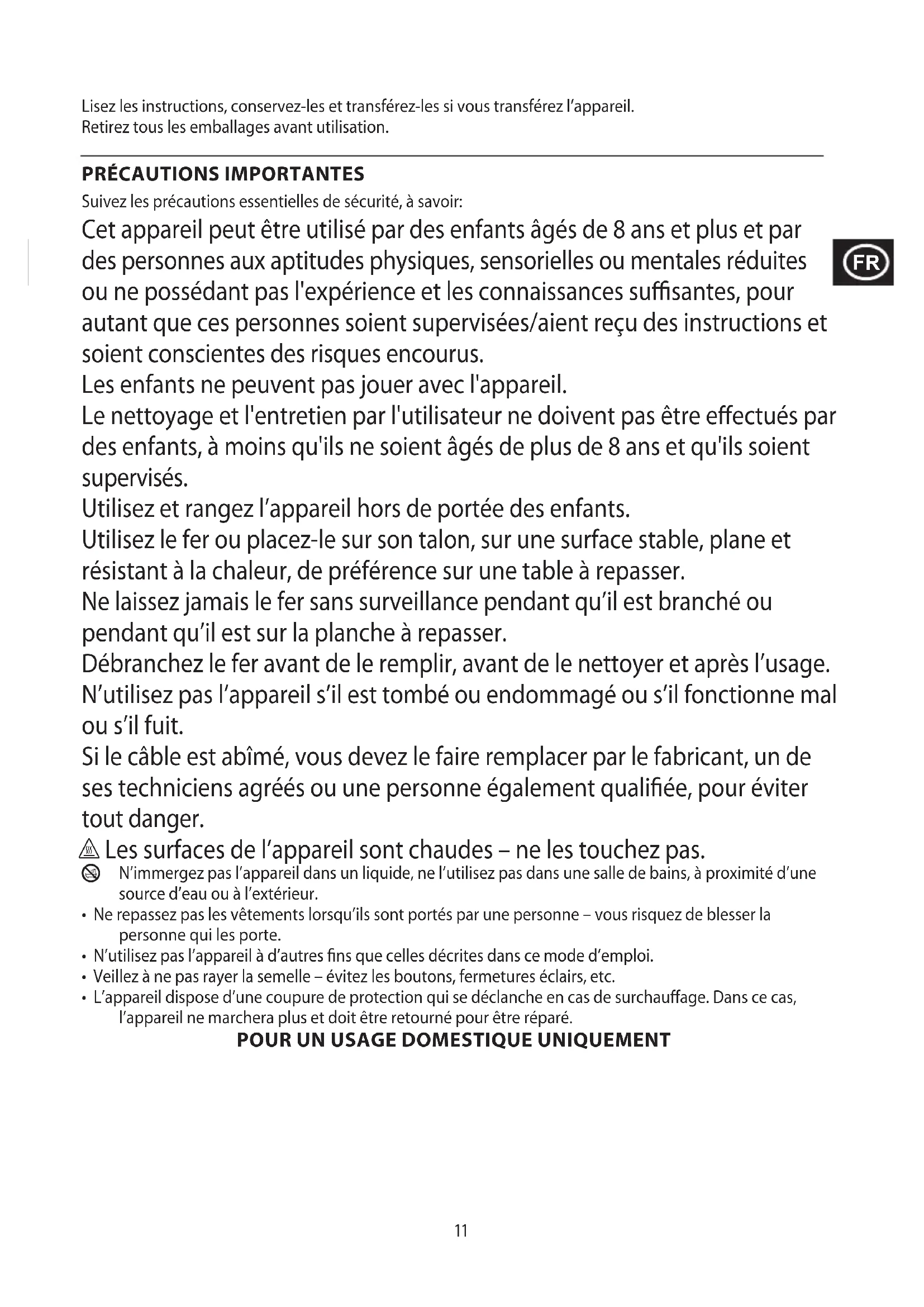 Suivez les précautions essentielles de sécurité, à savoir: Cet appareil peut être utilisé par des enfants âgés de 8 ans et plus et par des personnes aux aptitudes physiques, sensorielles ou mentales réduites ou ne possédant pas l'expérience et les connaissances susantes, pour autant que ces personnes soient supervisées/aient reçu des instructions et soient conscientes des risques encourus. Les enfants ne peuvent pas jouer avec l'appareil. Le nettoyage et l'entretien par l'utilisateur ne doivent pas être eectués par des enfants, à moins qu'ils ne soient âgés de plus de 8 ans et qu'ils soient supervisés. Utilisez et rangez l’appareil hors de portée des enfants. Utilisez le fer ou placez-le sur son talon, sur une surface stable, plane et résistant à la chaleur, de préférence sur une table à repasser. Ne laissez jamais le fer sans surveillance pendant qu’il est branché ou pendant qu’il est sur la planche à repasser. Débranchez le fer avant de le remplir, avant de le nettoyer et après l’usage. N’utilisez pas l’appareil s’il est tombé ou endommagé ou s’il fonctionne mal ou s’il fuit. Si le câble est abîmé, vous devez le faire remplacer par le fabricant, un de ses techniciens agréés ou une personne également qualiée, pour éviter tout danger. h Les surfaces de l’appareil sont chaudes – ne les touchez pas.