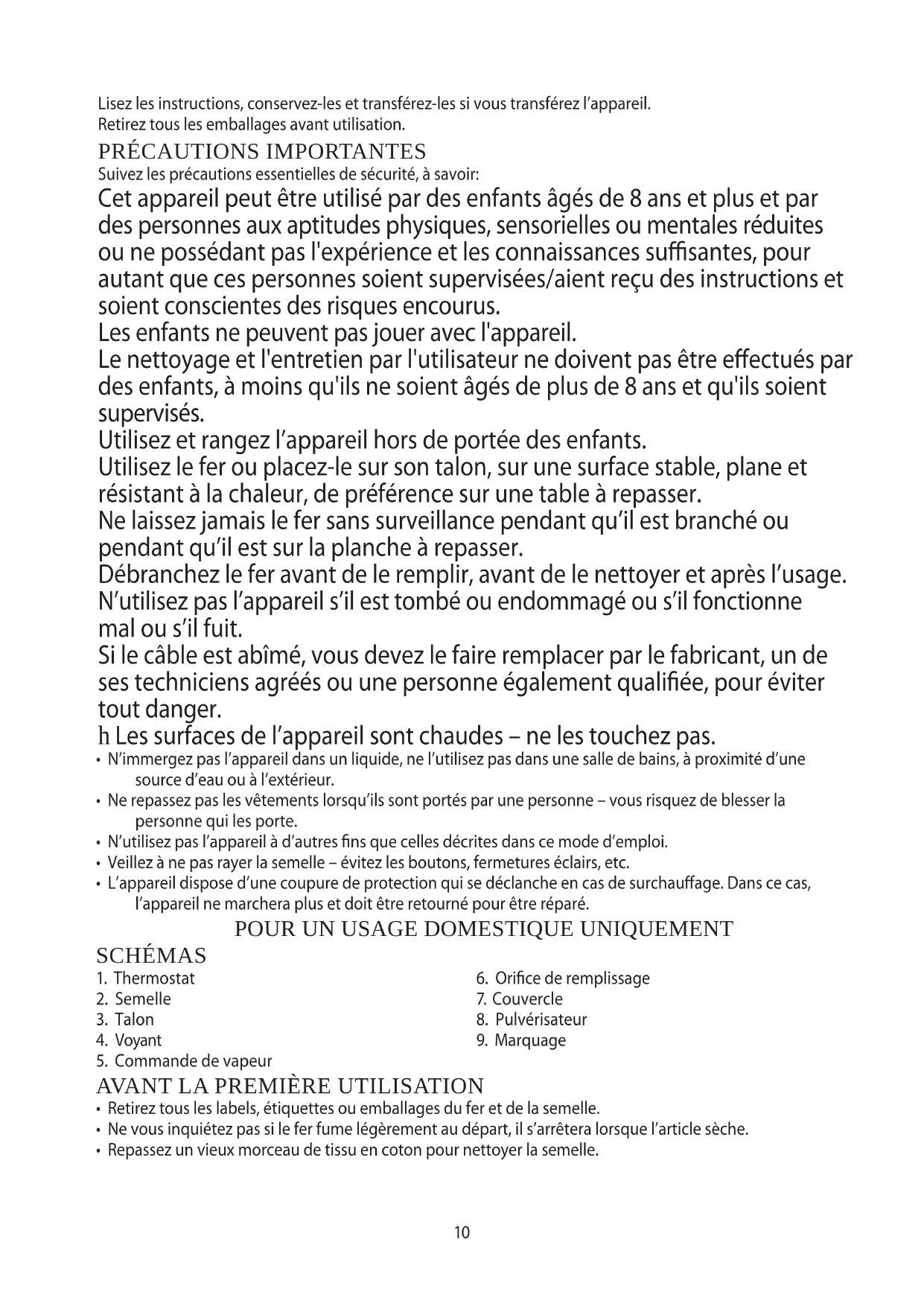 Suivez les précautions essentielles de sécurité, à savoir: Cet appareil peut être utilisé par des enfants âgés de 8 ans et plus et par des personnes aux aptitudes physiques, sensorielles ou mentales réduites ou ne possédant pas l'expérience et les connaissances suffisantes, pour autant que ces personnes soient supervisées/aient reçu des instructions et soient conscientes des risques encourus. Les enfants ne peuvent pas jouer avec l'appareil. Le nettoyage et l'entretien par l'utilisateur ne doivent pas être effectués par des enfants, à moins qu'ils ne soient âgés de plus de 8 ans et qu'ils soient supervisés. Utilisez et rangez l’appareil hors de portée des enfants. Utilisez le fer ou placez-le sur son talon, sur une surface stable, plane et résistant à la chaleur, de préférence sur une table à repasser. Ne laissez jamais le fer sans surveillance pendant qu’il est branché ou pendant qu’il est sur la planche à repasser. Débranchez le fer avant de le remplir, avant de le nettoyer et après l’usage. N’utilisez pas l’appareil s’il est tombé ou endommagé ou s’il fonctionne mal ou s’il fuit. Si le câble est abîmé, vous devez le faire remplacer par le fabricant, un de ses techniciens agréés ou une personne également qualifiée, pour éviter tout danger. h Les surfaces de l’appareil sont chaudes – ne les touchez pas.