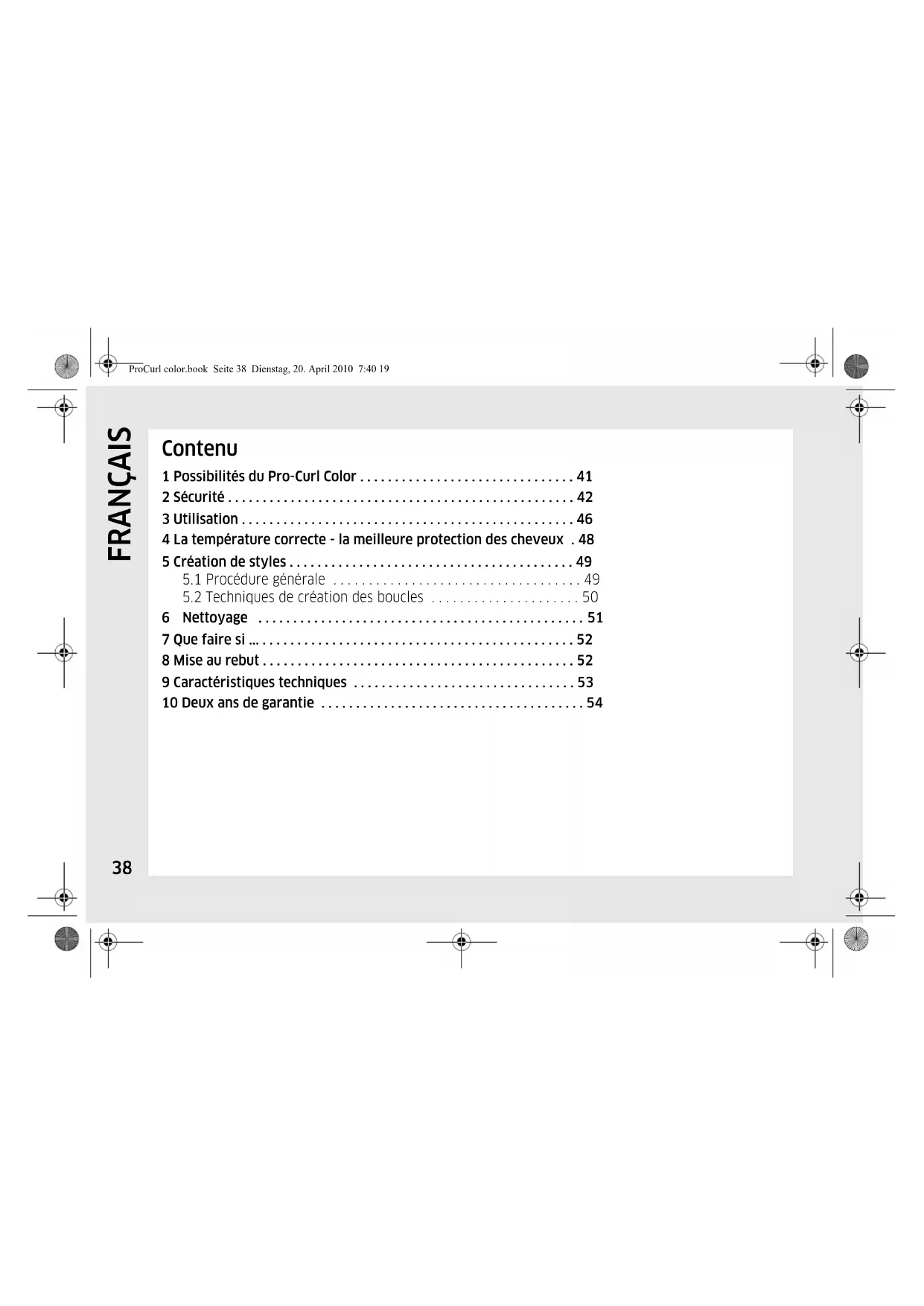 - La diversité actuelle des substances chimiques ne permet pas d’exclure totalement que le maté- ProCurl color.book Seite 44 Dienstag, 20. April 2010 7:40 19FRANÇAIS