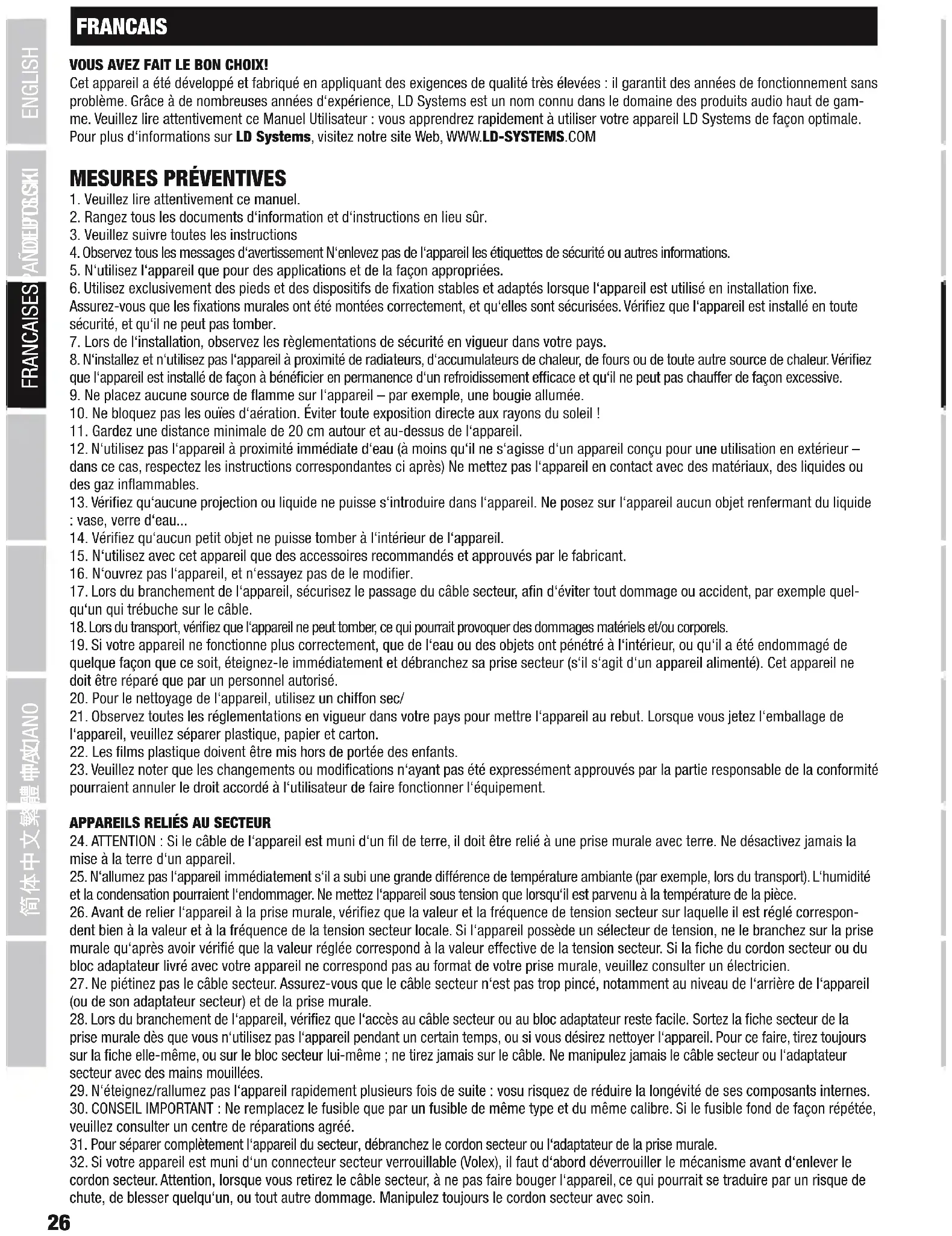 FRANCAIS VOUS AVEZ FAIT LE BON CHOIX! Cet appareil a été développé et fabriqué en appliquant des exigences de qualité très élevées : il garantit des années de fonctionnement sans problème. Grâce à de nombreuses années d‘expérience, LD Systems est un nom connu dans le domaine des produits audio haut de gam- me. Veuillez lire attentivement ce Manuel Utilisateur : vous apprendrez rapidement à utiliser votre appareil LD Systems de façon optimale. Pour plus d‘informations sur LD Systems, visitez notre site Web, WWW.LD-SYSTEMS.COM