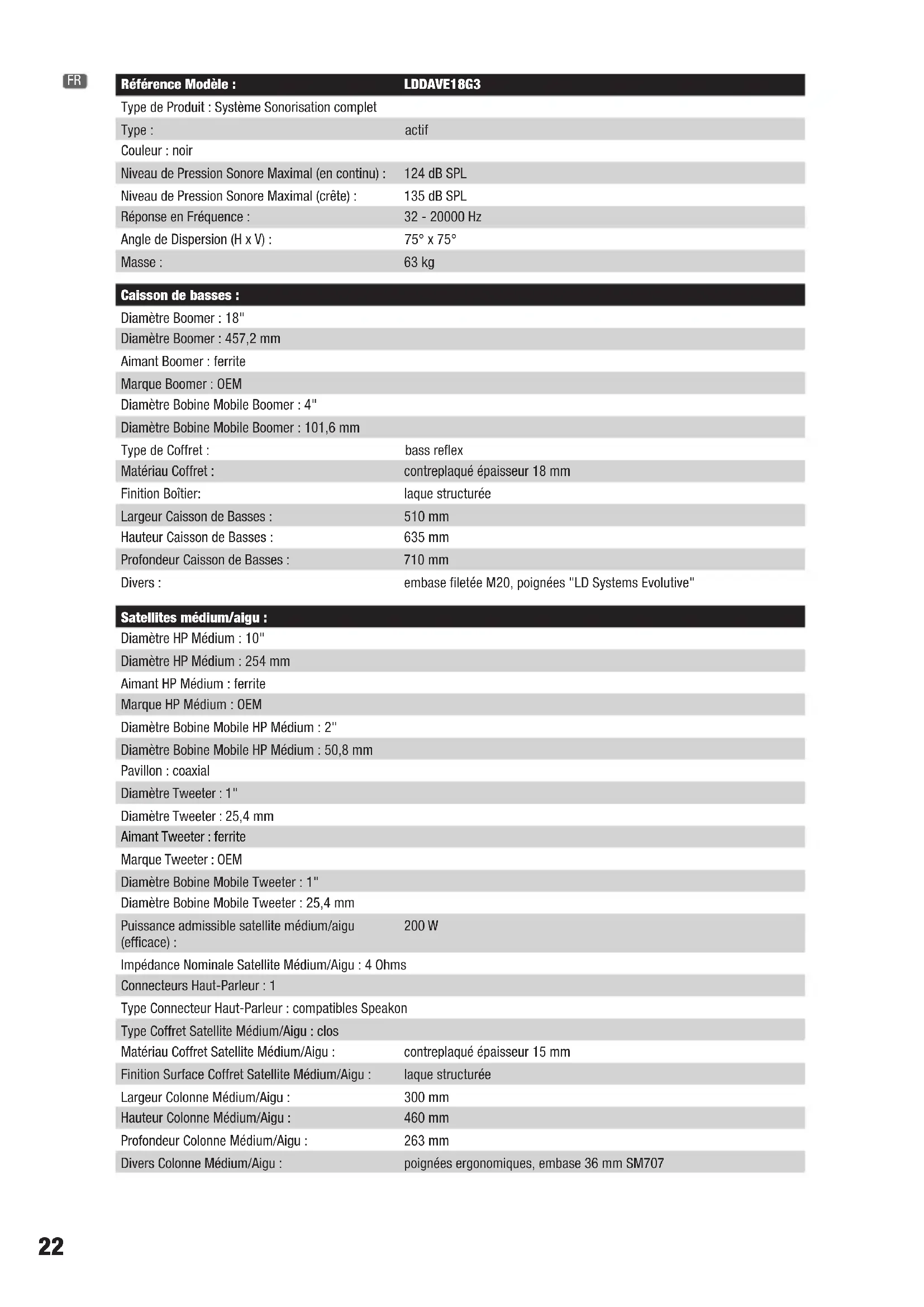 Satellites médium/aigu : Diamètre HP Médium : 10" Diamètre HP Médium : 254 mm Aimant HP Médium : ferrite Marque HP Médium : OEM Diamètre Bobine Mobile HP Médium : 2" Diamètre Bobine Mobile HP Médium : 50,8 mm Pavillon : coaxial Diamètre Tweeter : 1" Diamètre Tweeter : 25,4 mm Aimant Tweeter : ferrite Marque Tweeter : OEM Diamètre Bobine Mobile Tweeter : 1" Diamètre Bobine Mobile Tweeter : 25,4 mm Puissance admissible satellite médium/aigu (efficace) : 200 W Impédance Nominale Satellite Médium/Aigu : 4 Ohms Connecteurs Haut-Parleur : 1 Type Connecteur Haut-Parleur : compatibles Speakon Type Coffret Satellite Médium/Aigu : clos Matériau Coffret Satellite Médium/Aigu : contreplaqué épaisseur 15 mm Finition Surface Coffret Satellite Médium/Aigu : laque structurée Largeur Colonne Médium/Aigu : 300 mm Hauteur Colonne Médium/Aigu : 460 mm Profondeur Colonne Médium/Aigu : 263 mm Divers Colonne Médium/Aigu : poignées ergonomiques, embase 36 mm SM707 Référence Modèle : LDDAVE18G3 Type de Produit : Système Sonorisation complet Type : actif Couleur : noir Niveau de Pression Sonore Maximal (en continu) : 124 dB SPL Niveau de Pression Sonore Maximal (crête) : 135 dB SPL Réponse en Fréquence : 32 - 20000 Hz Angle de Dispersion (H x V) : 75° x 75° Masse: 63 kg Caisson de basses : Diamètre Boomer : 18" Diamètre Boomer : 457,2 mm Aimant Boomer : ferrite Marque Boomer : OEM Diamètre Bobine Mobile Boomer : 4" Diamètre Bobine Mobile Boomer : 101,6 mm Type de Coffret : bass reflex Matériau Coffret : contreplaqué épaisseur 18 mm Finition Boîtier: laque structurée Largeur Caisson de Basses : 510 mm Hauteur Caisson de Basses : 635 mm Profondeur Caisson de Basses : 710 mm Divers : embase filetée M20, poignées "LD Systems Evolutive"23 Module Amplificateur (intégré au caisson de basses) Étages de puissance : Classe D Puissance Totale Système (efficace) : 1200 W Puissance Totale Système (crête) : 4800 W Puissance Amplificateur Caisson de Graves (efficace) : 800 W Puissance Amplificateur Caisson de Graves (crête) : 3200 W Puissance Amplificateurs Colonne Médium/Aigu (efficace) : 2 x 200 W Puissance Amplificateurs Colonne Médium/Aigu (crête) : 2 x 800 W Fonctions de Protection : surcharge, limiteur, court-circuit Refroidissement : par convexion Contrôles : potentiomètres Sub Level et Main Level, interrupteurs Power et Subwoo- fer Phase Reverse Indicateurs : On, Signal, Limit, Protect Alimentation : à découpage Tension Secteur : 100 - 120 V, 50 - 60 Hz