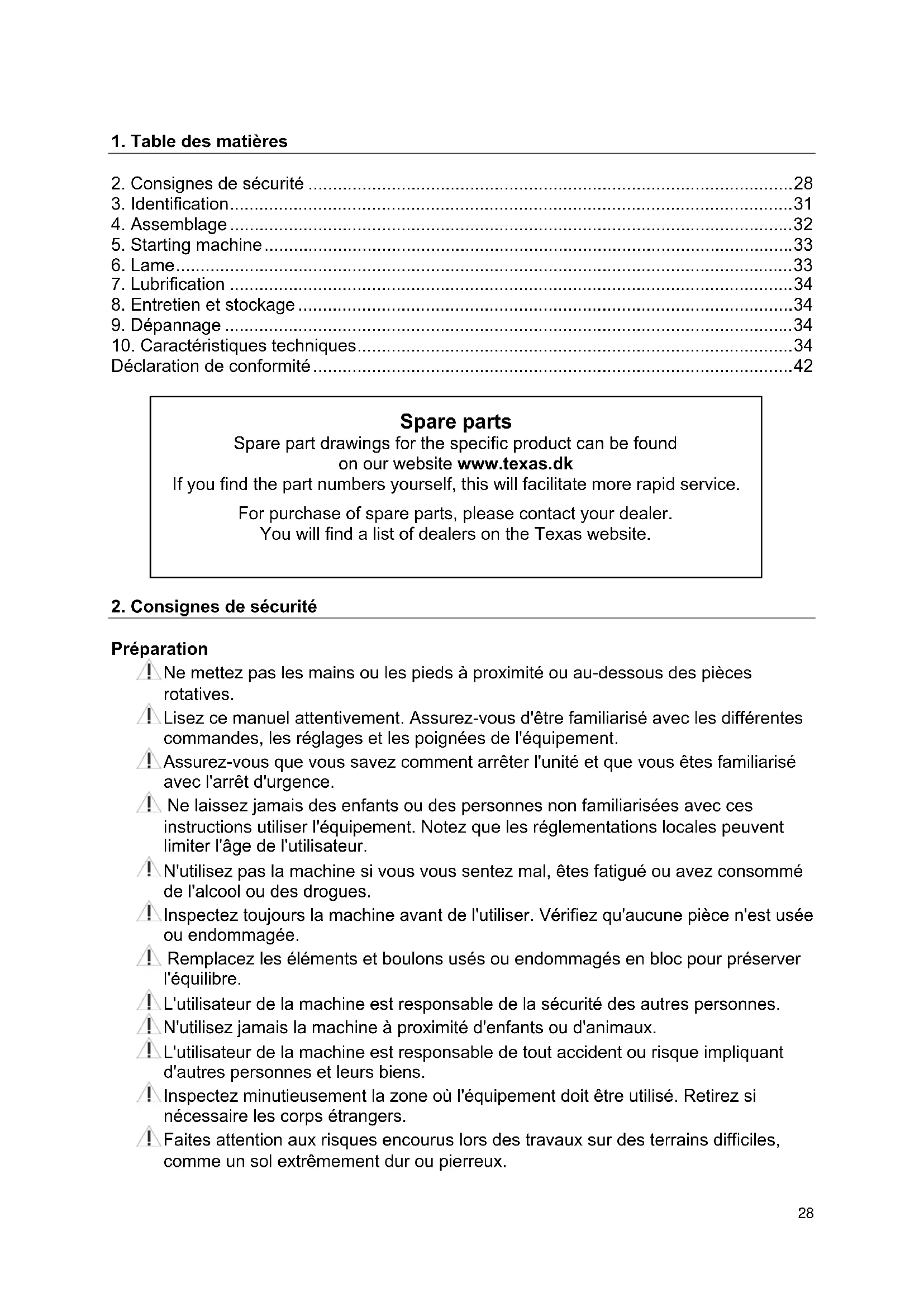 Préparation Ne mettez pas les mains ou les pieds à proximité ou au-dessous des pièces rotatives. Lisez ce manuel attentivement. Assurez-vous d'être familiarisé avec les différentes commandes, les réglages et les poignées de l'équipement. Assurez-vous que vous savez comment arrêter l'unité et que vous êtes familiarisé avec l'arrêt d'urgence. Ne laissez jamais des enfants ou des personnes non familiarisées avec ces instructions utiliser l'équipement. Notez que les réglementations locales peuvent limiter l'âge de l'utilisateur. N'utilisez pas la machine si vous vous sentez mal, êtes fatigué ou avez consommé de l'alcool ou des drogues. Inspectez toujours la machine avant de l'utiliser. Vérifiez qu'aucune pièce n'est usée ou endommagée. Remplacez les éléments et boulons usés ou endommagés en bloc pour préserver l'équilibre. L'utilisateur de la machine est responsable de la sécurité des autres personnes. N'utilisez jamais la machine à proximité d'enfants ou d'animaux. L'utilisateur de la machine est responsable de tout accident ou risque impliquant d'autres personnes et leurs biens. Inspectez minutieusement la zone où l'équipement doit être utilisé. Retirez si nécessaire les corps étrangers. Faites attention aux risques encourus lors des travaux sur des terrains difficiles, comme un sol extrêmement dur ou pierreux. Spare parts Spare part drawings for the specific product can be found on our website www.texas.dk If you find the part numbers yourself, this will facilitate more rapid service. For purchase of spare parts, please contact your dealer. You will find a list of dealers on the Texas website.29 Il est indispensable de porter des bottes à semelles antidérapantes et gaine en acier. Évitez de porter des vêtements amples. Utilisation Démarrez toujours le moteur dans la zone de sécurité. Ne quittez pas la zone de sécurité lors de l'utilisation de la machine. Si vous devez quitter la zone de sécurité, coupez le moteur avant de quitter la zone. Après avoir heurté un corps étranger, arrêtez immédiatement le moteur et inspectez minutieusement la machine pour détecter un éventuel dégât. Réparez le dégât avant de continuer. Si la machine commence à vibrer de manière anormale, arrêtez le moteur et identifiez immédiatement la cause. Les vibrations signalent en général un dégât. Mettez toujours les leviers au point mort, coupez le moteur et lorsque l'unité n'est pas surveillée. Coupez toujours le moteur et vérifiez que toutes les parties mobiles sont complètement arrêtées avant de réaliser une réparation, un réglage ou une inspection. Faites preuve d'une extrême prudence lors d'une utilisation en pente. N'utilisez jamais la machine à vive allure. Ne dépassez pas la capacité de la machine en essayant de travailler trop rapidement. Ne transportez pas de passagers. Faites preuve d'attention lorsque la machine est en marche arrière. Ne laissez jamais des passants se tenir devant l'unité. Dégagez toujours les lames lorsque la machine n'est pas utilisée. Utilisez uniquement la machine de jour ou dans des zones entièrement éclairées. Assurez une bonne stabilité et gardez toujours une bonne prise sur les poignées. Marchez toujours, ne courez jamais. N'utilisez pas l'équipement pieds nus ou en portant des sandales. Faites preuve d'une extrême prudence lorsque vous changez de sens sur les pentes. Sur les fraises arrière, vérifiez que les lames sont protégées par un écran de protection, seule la partie des lames qui pénètre dans le sol doit être libre. N'essayez jamais d'effectuer des réglages lorsque le moteur est en marche. Faites preuve d'une extrême prudence en marche arrière ou lorsque vous tirez la machine en arrière.30 Entretien et rangement Le moteur doit être coupé lors des travaux de maintenance et de nettoyage, du changement d'outils et du transport par d'autres moyens que son propre déplacement. Vérifiez régulièrement que tous les boulons et écrous sont serrés. Resserrez-les si nécessaire. Le moteur doit être complètement refroidi avant d'être rangé à l'intérieur ou couvert. Si la machine n'est pas utilisée pendant un certain temps, veuillez consulter les consignes de ce manuel. Si nécessaire, les étiquettes de sécurité et de consignes doivent être entretenues et remplacées. Utilisez uniquement des pièces de rechange ou accessoires d'origine. En cas d'utilisation d'autres pièces ou accessoires, la responsabilité ne s'applique plus. Remplacez les pots d'échappement défectueux.