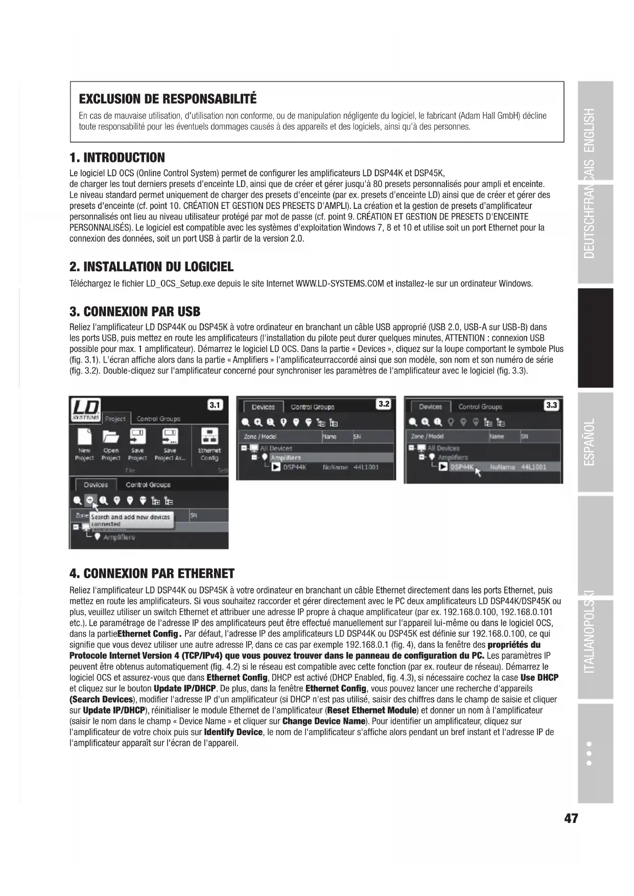 Reliez l'amplificateur LD DSP44K ou DSP45K à votre ordinateur en branchant un câble Ethernet directement dans les ports Ethernet, puis mettez en route les amplificateurs. Si vous souhaitez raccorder et gérer directement avec le PC deux amplificateurs LD DSP44K/DSP45K ou plus, veuillez utiliser un switch Ethernet et attribuer une adresse IP propre à chaque amplificateur (par ex. 192.168.0.100, 192.168.0.101 etc.). Le paramétrage de l'adresse IP des amplificateurs peut être effectué manuellement sur l'appareil lui-même ou dans le logiciel OCS, dans la partieEthernet Config . Par défaut, l'adresse IP des amplificateurs LD DSP44K ou DSP45K est définie sur 192.168.0.100, ce qui signifie que vous devez utiliser une autre adresse IP, dans ce cas par exemple 192.168.0.1 (fig. 4), dans la fenêtre des propriétés du Protocole Internet Version 4 (TCP/IPv4) que vous pouvez trouver dans le panneau de configuration du PC. Les paramètres IP peuvent être obtenus automatiquement (fig.4.2) si le réseau est compatible avec cette fonction (par ex. routeur de réseau). Démarrez le logiciel OCS et assurez-vous que dans Ethernet Config, DHCP est activé (DHCP Enabled, fig. 4.3), si nécessaire cochez la case Use DHCP et cliquez sur le bouton Update IP/DHCP. De plus, dans la fenêtre Ethernet Config, vous pouvez lancer une recherche d'appareils (Search Devices), modifier l'adresse IP d'un amplificateur (si DHCP n'est pas utilisé, saisir des chiffres dans le champ de saisie et cliquer sur Update IP/DHCP), réinitialiser le module Ethernet de l'amplificateur (Reset Ethernet Module) et donner un nom à l'amplificateur (saisir le nom dans le champ «Device Name» et cliquer sur Change Device Name). Pour identifier un amplificateur, cliquez sur l'amplificateur de votre choix puis sur Identify Device, le nom de l'amplificateur s'affiche alors pendant un bref instant et l'adresse IP de l'amplificateur apparaît sur l'écran de l'appareil.48 ITALIANO POLSKI ESPAÑOL FRANCAIS DEUTSCHENGLISH