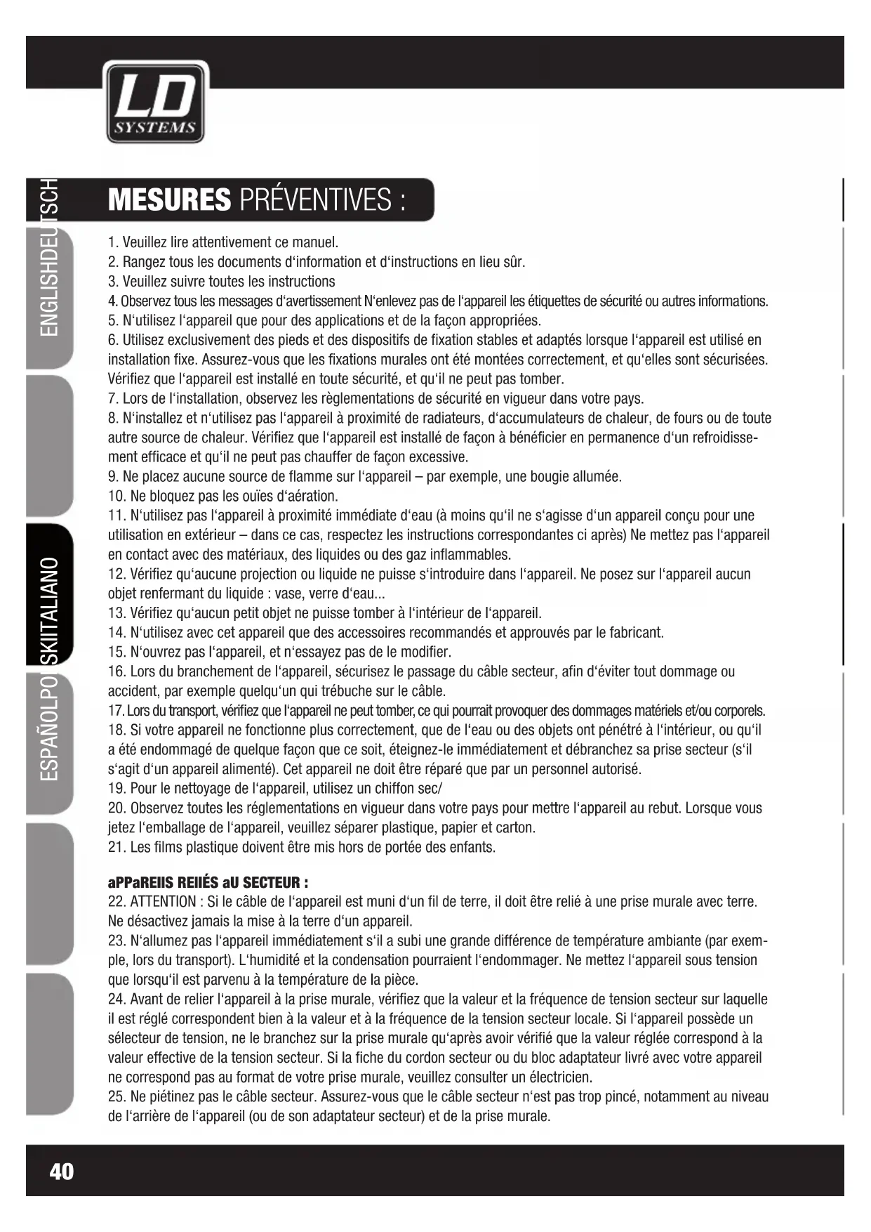 ENGLISHDEUTSCHFRANCAIS FRANCAISFRANCAIS FRANCAISFRANCAIS ESpAñoLpoLSKIITALIANo Vous avez fait le bon choix ! Cet appareil a été développé et fabriqué en appliquant des exigences de qualité très élevées : il garantit des années de fonctionnement sans problème. Grâce à de nombreuses années d‘expérience, LD Systems est un nom connu dans le domaine des produits audio haut de gamme. Veuillez lire attentivement ce Manuel Utilisateur : vous apprendrez rapidement à utiliser votre appareil LD Systems de façon optimale. Pour plus d‘informations sur LD Systems, visitez notre site Web, WWW.LD-SYSTeMS.COMmixeur racKaBle 2 zoneS LDzONE423
