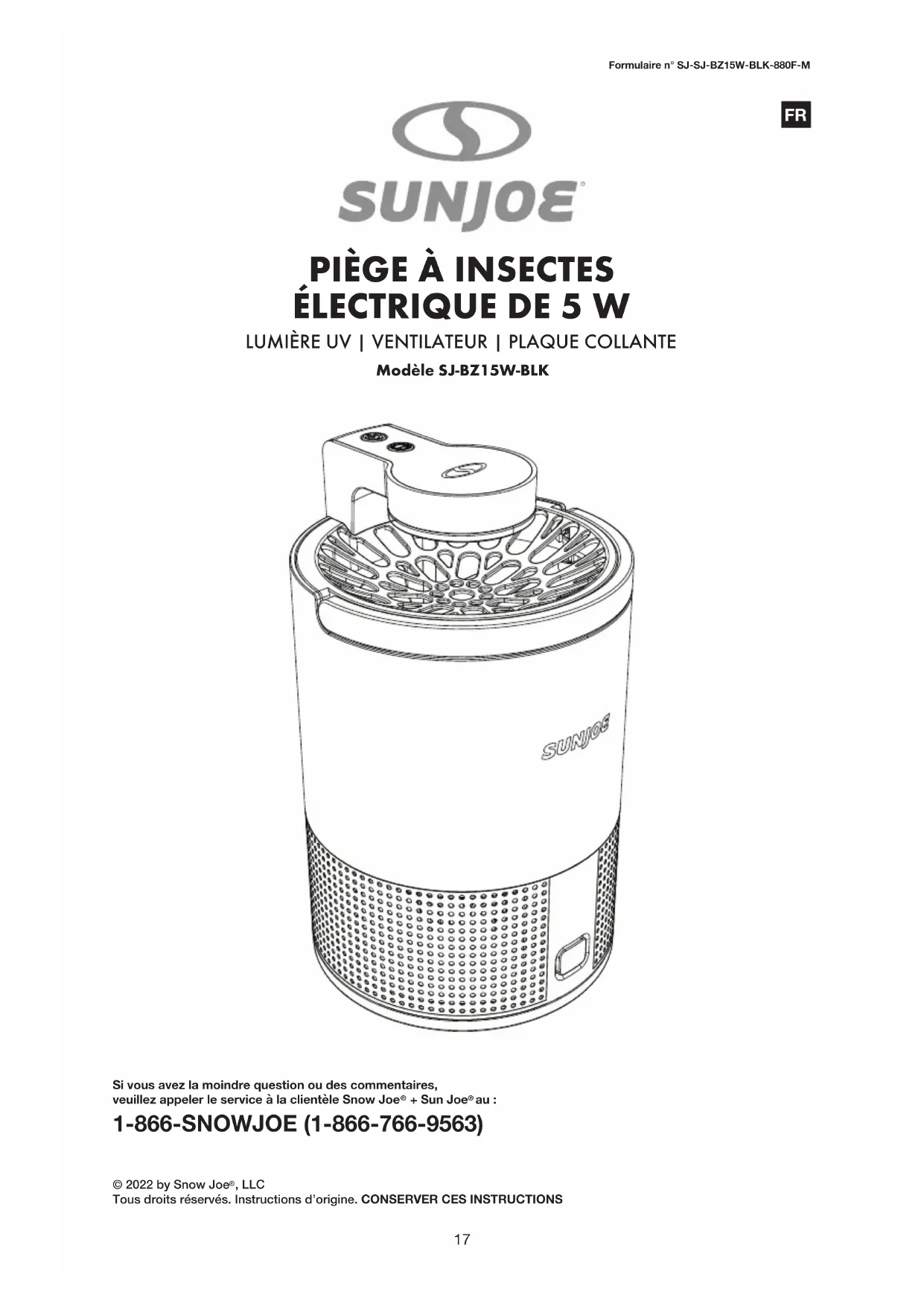 SJBZ15WBLK - Lutte antiparasitaire Sun Joe - Notice d'utilisation et mode d'emploi gratuit