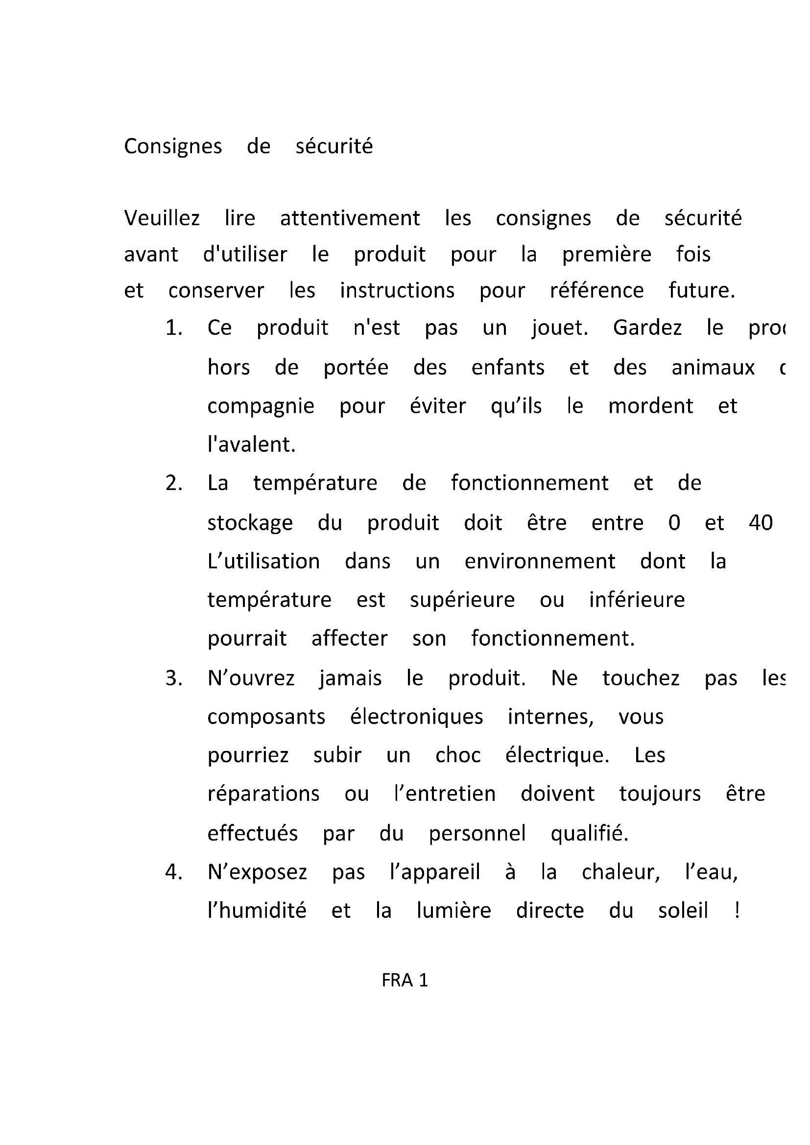 Consignes de sécurité Veuillez lire attentivement les consignes de sécurité avant d'utiliser le produit pour la première fois et conserver les instructions pour référence future.