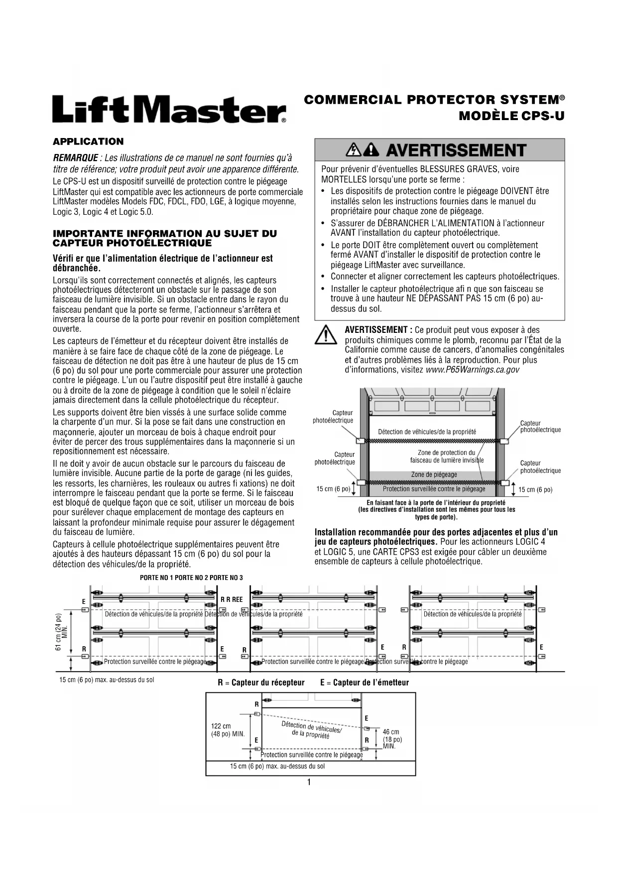 Vérifi er que l’alimentation électrique de l’actionneur est débranchée. Lorsqu'ils sont correctement connectés et alignés, les capteurs photoélectriques détecteront un obstacle sur le passage de son faisceau de lumière invisible. Si un obstacle entre dans le rayon du faisceau pendant que la porte se ferme, l’actionneur s’arrêtera et inversera la course de la porte pour revenir en position complètement ouverte. Les capteurs de l’émetteur et du récepteur doivent être installés de manière à se faire face de chaque côté de la zone de piégeage. Le faisceau de détection ne doit pas être à une hauteur de plus de 15 cm (6 po) du sol pour une porte commerciale pour assurer une protection contre le piégeage. L’un ou l’autre dispositif peut être installé à gauche ou à droite de la zone de piégeage à condition que le soleil n’éclaire jamais directement dans la cellule photoélectrique du récepteur. Les supports doivent être bien vissés à une surface solide comme la charpente d’un mur. Si la pose se fait dans une construction en maçonnerie, ajouter un morceau de bois à chaque endroit pour éviter de percer des trous supplémentaires dans la maçonnerie si un repositionnement est nécessaire. Il ne doit y avoir de aucun obstacle sur le parcours du faisceau de lumière invisible. Aucune partie de la porte de garage (ni les guides, les ressorts, les charnières, les rouleaux ou autres fi xations) ne doit interrompre le faisceau pendant que la porte se ferme. Si le faisceau est bloqué de quelque façon que ce soit, utiliser un morceau de bois pour surélever chaque emplacement de montage des capteurs en laissant la profondeur minimale requise pour assurer le dégagement du faisceau de lumière. Capteurs à cellule photoélectrique supplémentaires peuvent être ajoutés à des hauteurs dépassant 15 cm (6 po) du sol pour la détection des véhicules/de la propriété. Capteur photoélectriqueCapteur photoélectrique APPLICATION REMARQUE : Les illustrations de ce manuel ne sont fournies qu’à titre de référence; votre produit peut avoir une apparence différente. Le CPS-U est un dispositif surveillé de protection contre le piégeage LiftMaster qui est compatible avec les actionneurs de porte commerciale LiftMaster modèles Models FDC, FDCL, FDO, LGE, à logique moyenne, Logic 3, Logic 4 et Logic 5.0. Détection de véhicules/de la propriétéProtection surveillée contre le piégeage15 cm (6 po) max. au-dessus du sol R E E ER