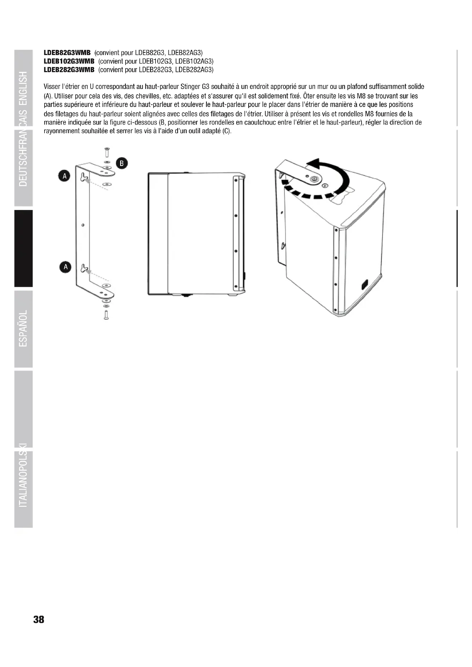 LDEB82G3WMB (convient pour LDEB82G3, LDEB82AG3) LDEB102G3WMB (convient pour LDEB102G3, LDEB102AG3) LDEB282G3WMB (convient pour LDEB282G3, LDEB282AG3) Visser l'étrier enU correspondant au haut-parleur Stinger G3 souhaité à un endroit approprié sur un mur ou un plafond suffisamment solide (A). Utiliser pour cela des vis, des chevilles, etc. adaptées et s'assurer qu'il est solidement fixé. Ôter ensuite les vis M8 se trouvant sur les parties supérieure et inférieure du haut-parleur et soulever le haut-parleur pour le placer dans l'étrier de manière à ce que les positions des filetages du haut-parleur soient alignées avec celles des filetages de l'étrier. Utiliser à présent les vis et rondelles M8 fournies de la manière indiquée sur la figure ci-dessous (B, positionner les rondelles en caoutchouc entre l'étrier et le haut-parleur), régler la direction de rayonnement souhaitée et serrer les vis à l'aide d'un outil adapté (C).