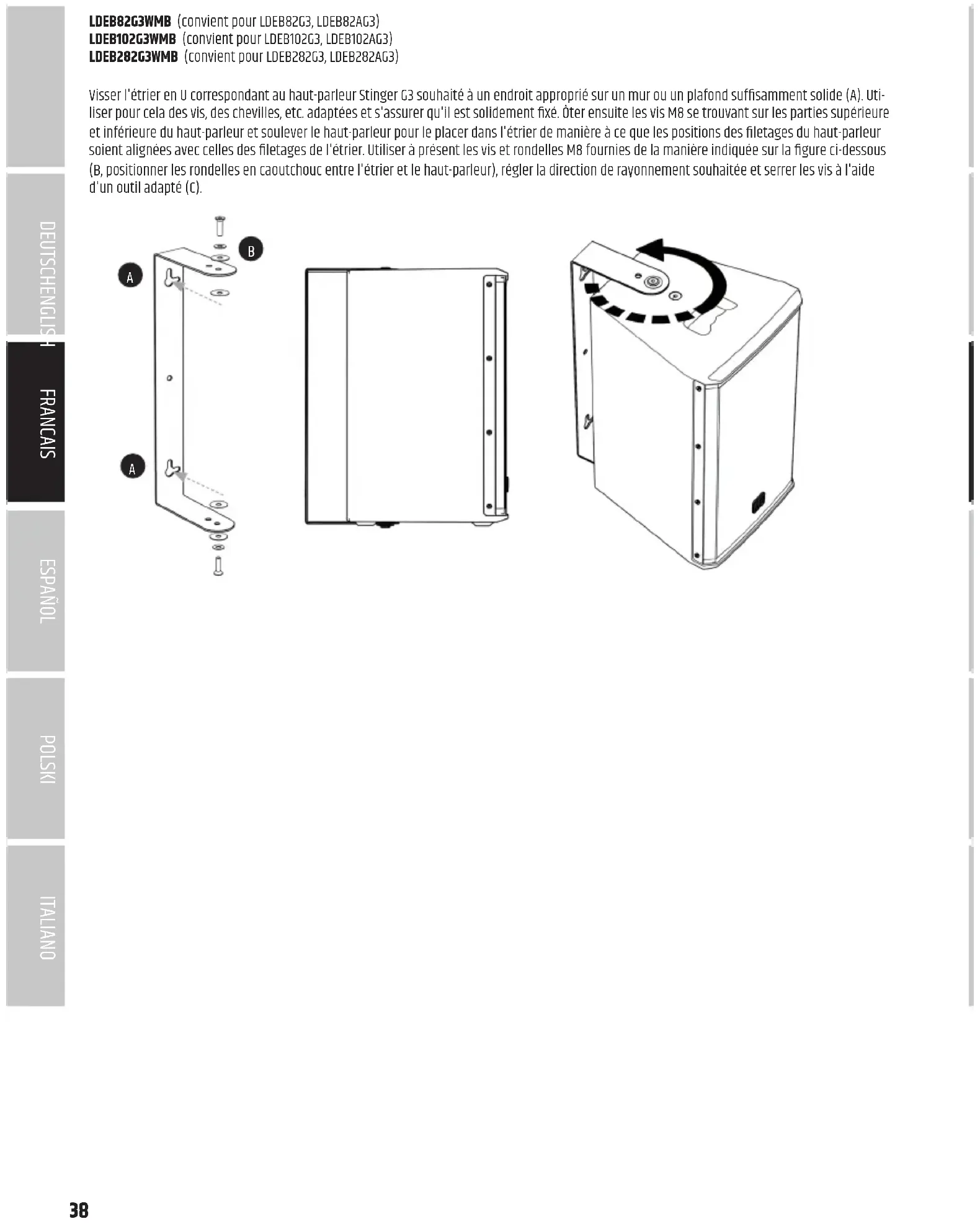 LDEB82G3WMB (convient pour LDEB82G3, LDEB82AG3) LDEB102G3WMB (convient pour LDEB102G3, LDEB102AG3) LDEB282G3WMB (convient pour LDEB282G3, LDEB282AG3) Visser l'étrier enU correspondant au haut-parleur Stinger G3 souhaité à un endroit approprié sur un mur ou un plafond sufsamment solide (A). Uti- liser pour cela des vis, des chevilles, etc. adaptées et s'assurer qu'il est solidement xé. Ôter ensuite les vis M8 se trouvant sur les parties supérieure et inférieure du haut-parleur et soulever le haut-parleur pour le placer dans l'étrier de manière à ce que les positions des letages du haut-parleur soient alignées avec celles des letages de l'étrier. Utiliser à présent les vis et rondelles M8 fournies de la manière indiquée sur la gure ci-dessous (B, positionner les rondelles en caoutchouc entre l'étrier et le haut-parleur), régler la direction de rayonnement souhaitée et serrer les vis à l'aide d'un outil adapté (C).