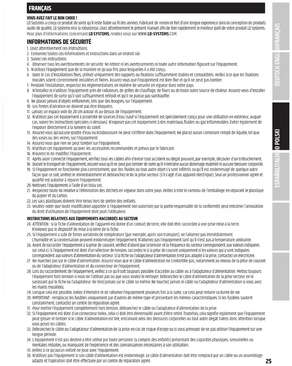 LD Systems a conçu ce produit de sorte qu'il reste fiable au fil des années. Fabricant de renom et fort d'une longue expérience dans la conception de produits audio de qualité, LD Systems privilégie la robustesse. Lisez attentivement le présent manuel afin de tirer rapidement le meilleur parti de votre produit LD Systems. Pour plus d'informations concernant LDSYSTEMs, rendez-vous sur WWW.LD-SYSTEMS.COM.