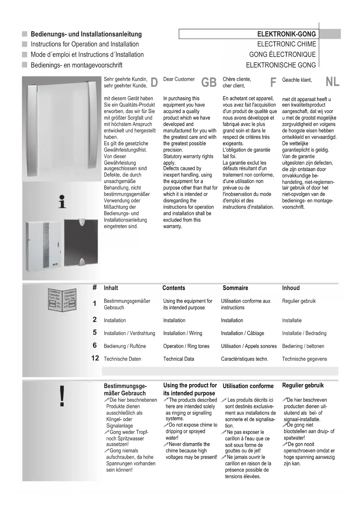 Bestimmungsge- mäßer Gebrauch !Die hier beschriebenen Produkte dienen ausschließlich als Klingel- oder Signalanlage !Gong weder Tropf- noch Spritzwasser aussetzen! !Gong niemals aufschrauben, da hohe Spannungen vorhanden sein können! Sommaire Utilisation conforme aux instructions Installation Installation / Câblage Utilisation / Appels sonores Caractéristiques techn. Contents Using the equipment for its intended purpose Installation Installation / Wiring Operation / Ring tones Technical Data Utilisation conforme Les produits décrits ici sont destinés exclusive- ment aux installations de sonnerie et de signalisa- tion. !Ne pas exposer le carillon à l'eau que ce soit sous forme de gouttes ou de jet! !Ne jamais ouvrir le carillon en raison de la présence possible de tensions élevées.
