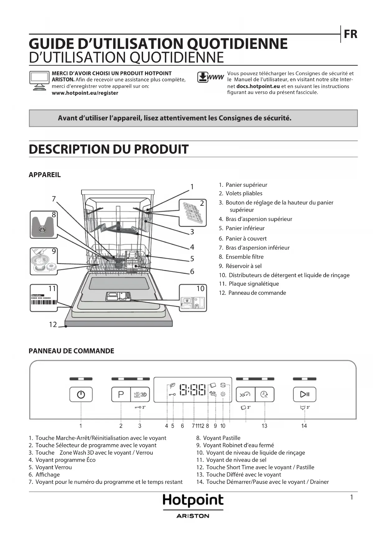 APPAREIL MERCI D’AVOIR CHOISI UN PRODUIT HOTPOINT ARISTON. Afin de recevoir une assistance plus complète, merci d’enregistrer votre appareil sur on: www.hotpoint.eu/registerVous pouvez télécharger les Consignes de sécurité et le Manuel de l’utilisateur, en visitant notre site Inter-net docs.hotpoint.eu et en suivant les instructions figurant au verso du présent fascicule.1. Panier supérieur2. Volets pliables3. Bouton de réglage de la hauteur du panier supérieur4. Bras d’aspersion supérieur5. Panier inférieur6. Panier à couvert7. Bras d’aspersion inférieur8. Ensemble ltre9. Réservoir à sel10. Distributeurs de détergent et liquide de rinçage11. Plaque signalétique12. Panneau de commande