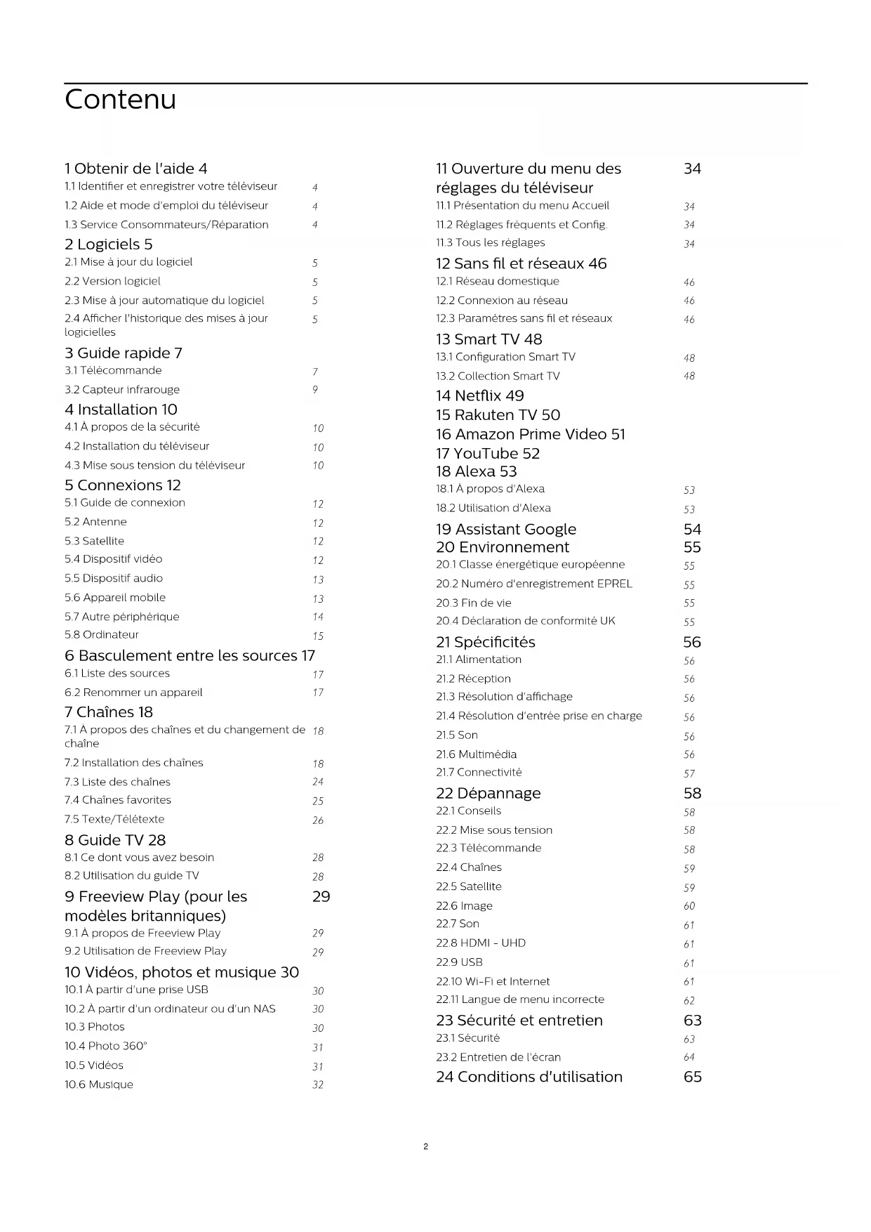 Conditions d'utilisation 2022 © TP Vision Europe B.V. Tous droits réservés. Ce produit a été mis sur le marché par TP Vision Europe B.V. ou une de ses filiales, ci-après dénommé TP Vision, qui est le fabricant du produit. TP Vision est le garant du téléviseur qui accompagne cette brochure. Philips et l'emblème du bouclier Philips sont des marques déposées de Koninklijke Philips N.V. Ces spécifications sont susceptibles d'être modifiées sans avis préalable. Les marques commerciales sont la propriété de Koninklijke Philips N.V ou de leurs détenteurs respectifs. TP Vision se réserve le droit de modifier les produits à tout moment, mais n'est pas contraint de modifier les offres précédentes en conséquence. La documentation écrite fournie avec le téléviseur et le manuel stocké dans la mémoire de celui-ci ou disponible en téléchargement sur le site Web de Philips www.philips.com/TVsupport sont jugés conformes à l'usage auquel le système est destiné. Le contenu de ce manuel est jugé conforme à l'usage auquel ce système est destiné. Si l'appareil ou les modules et procédures correspondants sont utilisés à d'autres fins que celles spécifiées dans le présent manuel, vous devez obtenir la confirmation de leur validité et de leur adéquation. TP Vision garantit que le matériel lui-même n'enfreint aucun brevet déposé aux États-Unis. Aucune garantie supplémentaire expresse ou tacite n'est formulée. TP Vision décline toute responsabilité quant aux éventuelles erreurs figurant dans ce document et aux problèmes qui en découlent. Les erreurs signalées à Philips seront corrigées et publiées sur le site Web d'assistance Philips dès que possible. Conditions de garantie : risque de blessure, dommages au téléviseur ou annulation de la garantie ! Ne tentez en aucun cas de réparer le téléviseur vous- même. Utilisez le téléviseur et les accessoires uniquement de la manière prévue par le fabricant. Le message d'avertissement imprimé à l'arrière du téléviseur signale un risque d'électrocution. Ne retirez en aucun cas le capot du téléviseur. Confiez toujours l'entretien et les réparations au Service consommateurs Philips. Recherchez le numéro de téléphone dans les documents imprimés fournis avec le téléviseur. Vous pouvez également consulter notre site Web www.philips.com/TVsupport et sélectionner votre pays, si nécessaire. Toute opération expressément interdite dans le présent manuel, ainsi que tout réglage ou toute procédure d'assemblage non recommandés ou non autorisés par ce manuel, entraînera l'annulation de la garantie. Caractéristiques des pixels Ce téléviseur possède un grand nombre de pixels de couleur. Bien que le taux de pixels effectifs soit de 99,999 % ou plus, il se peut que des points noirs ou des points de lumière (rouges, verts ou bleus) apparaissent de façon permanente à l'écran. Il s'agit d'une propriété structurelle de l'affichage (parmi les normes industrielles standard) et non d'un dysfonctionnement. Par conséquent, veuillez noter que cela ne peut en aucun cas donner lieu à une réparation, à un échange ou à un remboursement, pendant et/ou en dehors de la période de garantie. Conformité CE Par la présente, TP Vision Europe B.V. déclare que ce téléviseur est conforme aux exigences principales et aux autres dispositions concernées relatives aux directives 2014/53/UE (RED), 2009/125/CE (éco- conception) et 2011/65/CE (RoHS). Conformité aux normes EMF TP Vision fabrique et commercialise de nombreux produits destinés au grand public. Comme tous les appareils électroniques, ces produits peuvent émettre et recevoir des signaux électromagnétiques. L'un des principes fondamentaux adoptés par la société TP Vision consiste à prendre toutes les mesures qui s'imposent en matière de sécurité et de santé, conformément aux dispositions légales en cours, pour respecter les normes sur les champs électriques, magnétiques et électromagnétiques en vigueur au moment de la fabrication de ses produits. TP Vision s'engage à développer, produire et commercialiser des produits n'ayant aucun effet indésirable sur la santé. TP Vision confirme que ses produits, s'ils sont manipulés correctement et conformément à l'usage prévu, répondent aux règles de sécurité établies sur la base des connaissances scientifiques actuelles. TP Vision participe activement au développement des normes internationales relatives à la sécurité et aux champs électromagnétiques (EMF). Cet engagement permet à la société d'anticiper les évolutions ultérieures en matière de normalisation afin de les intégrer en avant- première dans ses produits.