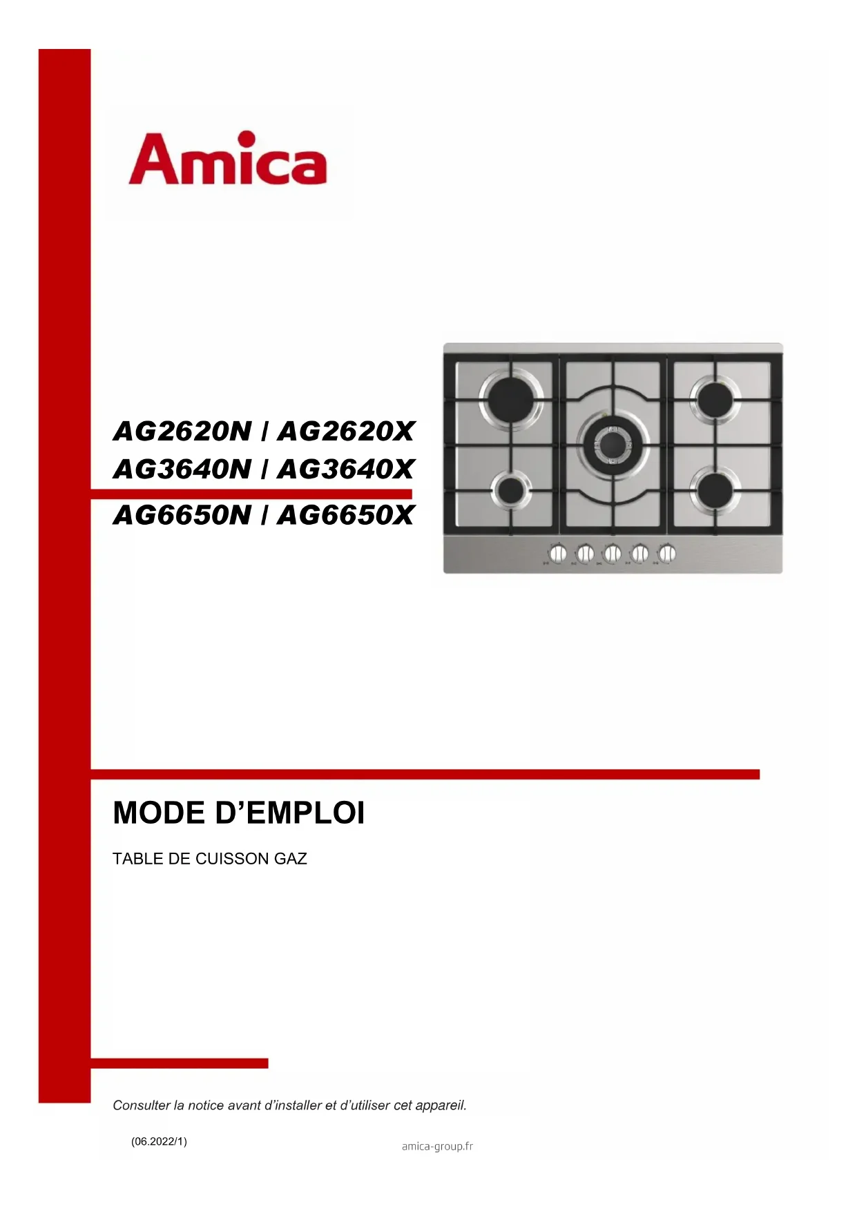 Consulter la notice avant d’installer et d’utiliser cet appareil. (06.2022/1) amica-group.fr2 Cette notice comporte des chapitres relatifs aux consignes de sécurité, aux consignes d’utilisation, aux consignes d’installation et aux conseils de dépannage. Une lecture attentive de cette notice avant d’utiliser cette table de cuisson vous aidera à utiliser et à entretenir le produit correctement. AVANT DE CONTACTER VOTRE SERVICE APRES VENTE Le chapitre concernant les conseils de dépannage vous aidera à résoudre vous-même certains problèmes courants sans avoir besoin de recourir au service de techniciens professionnels. NOTE : Le fabricant, conformément à une politique de développement permanent de mise à jour du produit, peut effectuer toute modification nécessaire sans donner de notification préalable. SOMMAIRE
