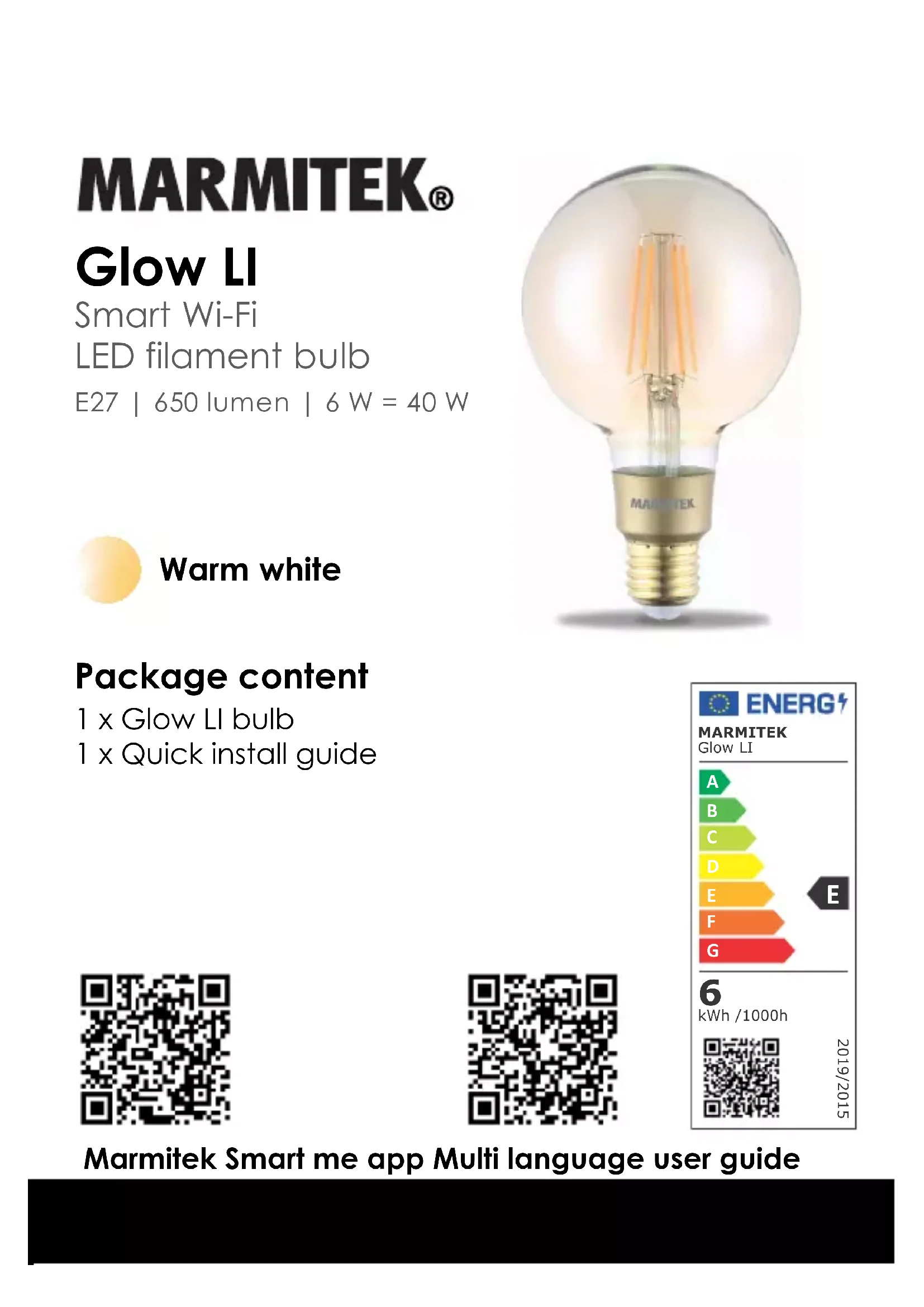 - Visitez notre site Web www.marmitek.com pour plus d'informations et pour savoir comment utiliser les produits Smart me. Caractéristiques techniques Type de lampe G95 Type de base E27 E27 Couleur de la lumière Blanc chaud Température de couleur 2500K Puissance 6 W Puissance 6 kWh/1000h Egal à 40 Watt Résistance à la lumière 650 lumens Angle de rayonnement 360 degrés Durée de vie heures/clics 15 000/15 000 Technologie sans fil Wi-Fi 2,4 GHz Alimentation 220-240 VAC 50/60 Hz Consommation en veille < 0,5 Watt Dimensions 95x163mm