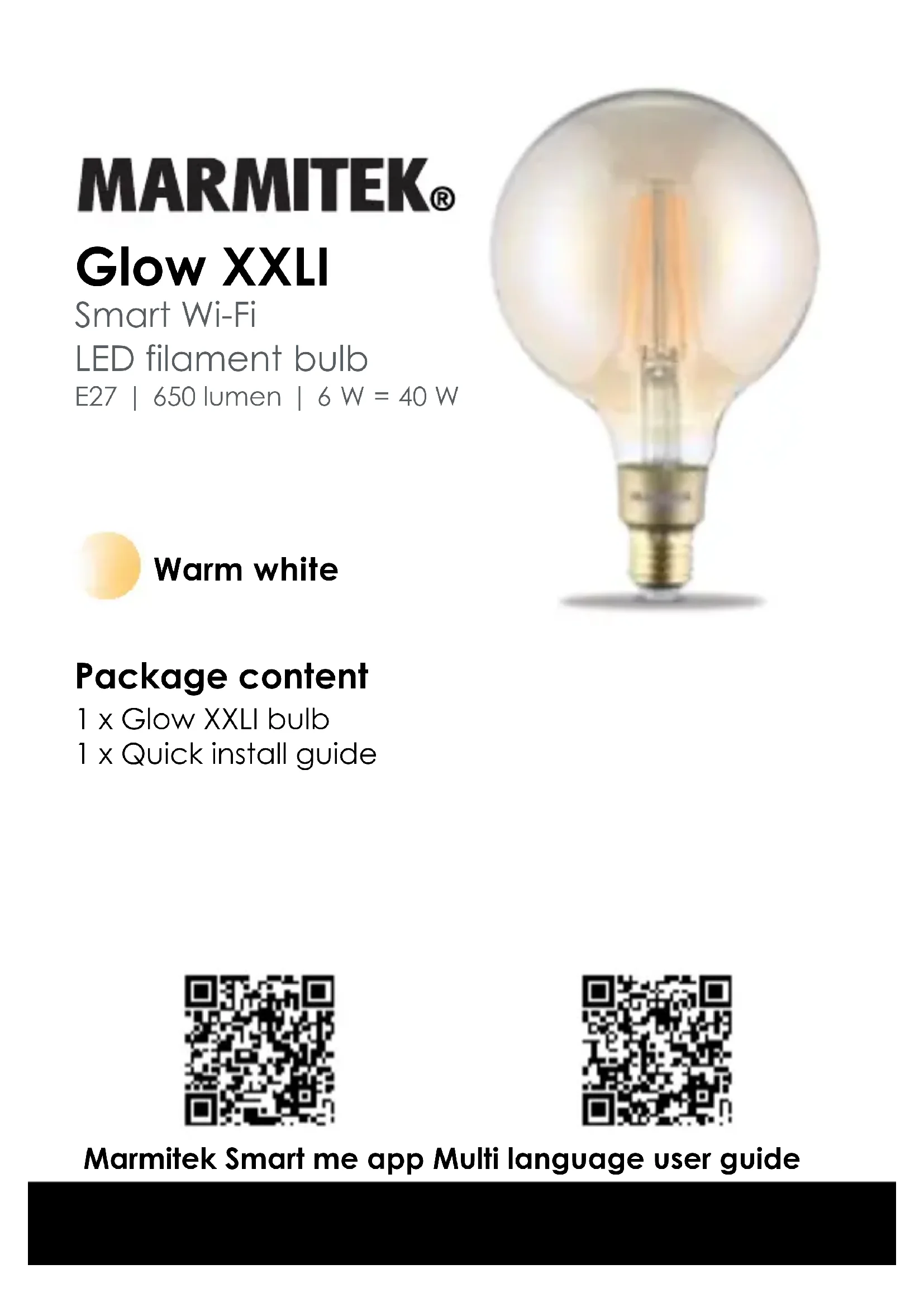 - Visitez notre site Web www.marmitek.com pour plus d'informations et pour savoir comment utiliser les produits Smart me. Caractéristiques techniques Type de lampe G125 Type de base E27 E27 Couleur de la lumière Blanc chaud Température de couleur 2500K Puissance 6 W Puissance 6 kWh/1000h Egal à 40 Watt Résistance à la lumière 650 lumen Angle de rayonnement 360 degrés Durée de vie heures/clics 15.000/15.000 Technologie sans fil Wi-Fi 2.4GHz Alimentation 220-240 VAC 50/60 Hz Consommation en veille < 0,5 Watt Dimensions 125x195mm