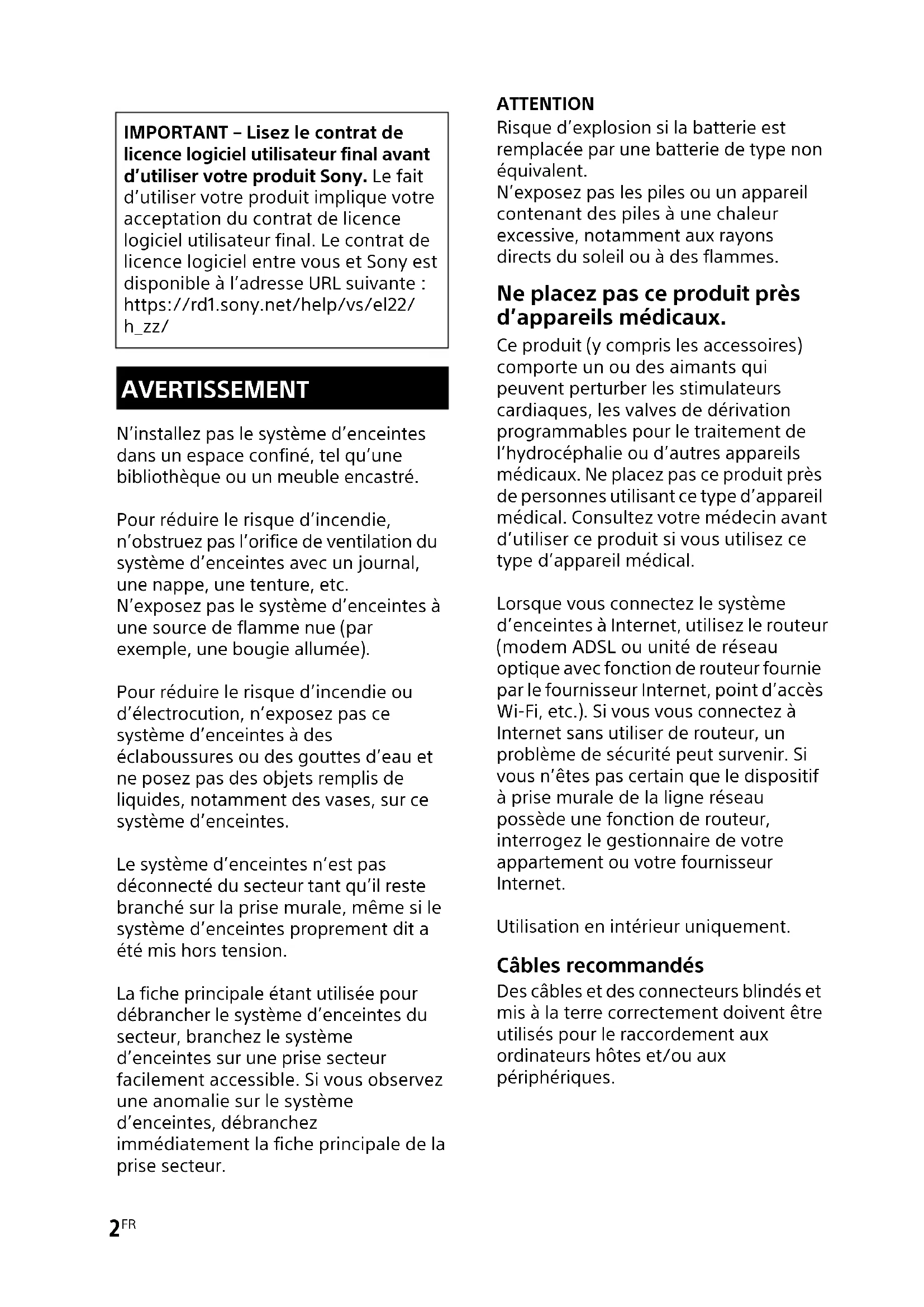 N’installez pas le système d’enceintes dans un espace confiné, tel qu’une bibliothèque ou un meuble encastré. Pour réduire le risque d’incendie, n’obstruez pas l’orifice de ventilation du système d’enceintes avec un journal, une nappe, une tenture, etc. N’exposez pas le système d’enceintes à une source de flamme nue (par exemple, une bougie allumée). Pour réduire le risque d’incendie ou d’électrocution, n’exposez pas ce système d’enceintes à des éclaboussures ou des gouttes d’eau et ne posez pas des objets remplis de liquides, notamment des vases, sur ce système d’enceintes. Le système d’enceintes n’est pas déconnecté du secteur tant qu’il reste branché sur la prise murale, même si le système d’enceintes proprement dit a été mis hors tension. La fiche principale étant utilisée pour débrancher le système d’enceintes du secteur, branchez le système d’enceintes sur une prise secteur facilement accessible. Si vous observez une anomalie sur le système d’enceintes, débranchez immédiatement la fiche principale de la prise secteur. ATTENTION Risque d’explosion si la batterie est remplacée par une batterie de type non équivalent. N’exposez pas les piles ou un appareil contenant des piles à une chaleur excessive, notamment aux rayons directs du soleil ou à des flammes. Ne placez pas ce produit près d’appareils médicaux. Ce produit (y compris les accessoires) comporte un ou des aimants qui peuvent perturber les stimulateurs cardiaques, les valves de dérivation programmables pour le traitement de l’hydrocéphalie ou d’autres appareils médicaux. Ne placez pas ce produit près de personnes utilisant ce type d’appareil médical. Consultez votre médecin avant d’utiliser ce produit si vous utilisez ce type d’appareil médical. Lorsque vous connectez le système d’enceintes à Internet, utilisez le routeur (modem ADSL ou unité de réseau optique avec fonction de routeur fournie par le fournisseur Internet, point d’accès Wi-Fi, etc.). Si vous vous connectez à Internet sans utiliser de routeur, un problème de sécurité peut survenir. Si vous n’êtes pas certain que le dispositif à prise murale de la ligne réseau possède une fonction de routeur, interrogez le gestionnaire de votre appartement ou votre fournisseur Internet. Utilisation en intérieur uniquement. Câbles recommandés Des câbles et des connecteurs blindés et mis à la terre correctement doivent être utilisés pour le raccordement aux ordinateurs hôtes et/ou aux périphériques. IMPORTANT – Lisez le contrat de licence logiciel utilisateur final avant d’utiliser votre produit Sony. Le fait d’utiliser votre produit implique votre acceptation du contrat de licence logiciel utilisateur final. Le contrat de licence logiciel entre vous et Sony est disponible à l’adresse URL suivante : https://rd1.sony.net/help/vs/el22/ h_zz/ AVERTISSEMENT3