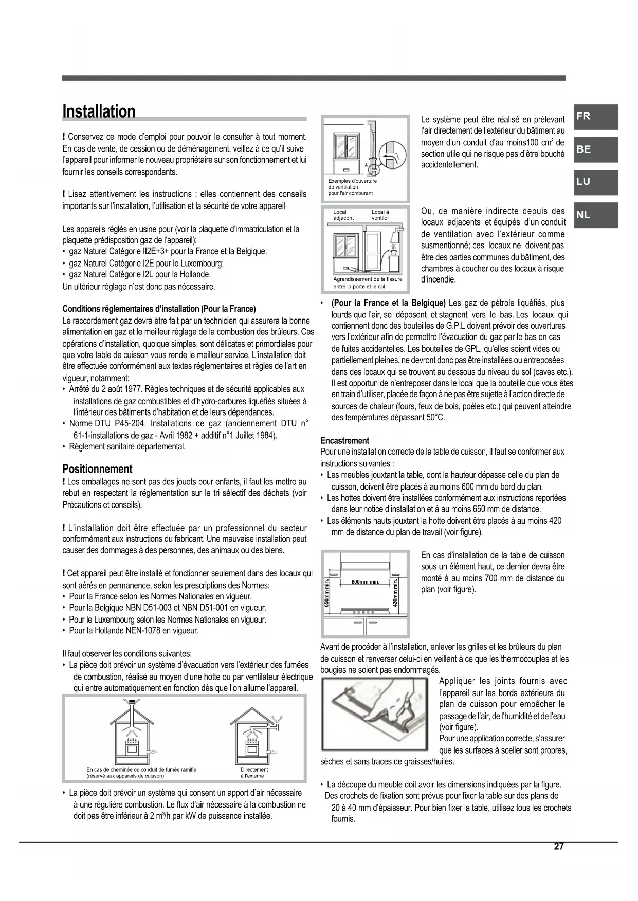 - gaz Naturel Catégorie I2L pour la Hollande. Un ultérieur réglage n’est donc pas nécessaire. Conditions réglementaires d’installation (Pour la France) Le raccordement gaz devra être fait par un technicien qui assurera la bonne alimentation en gaz et le meilleur réglage de la combustion des brûleurs. Ces opérations d’installation, quoique simples, sont délicates et primordiales pour que votre table de cuisson vous rende le meilleur service. L’installation doit être effectuée conformément aux textes réglementaires et règles de l’art en vigueur, notamment: