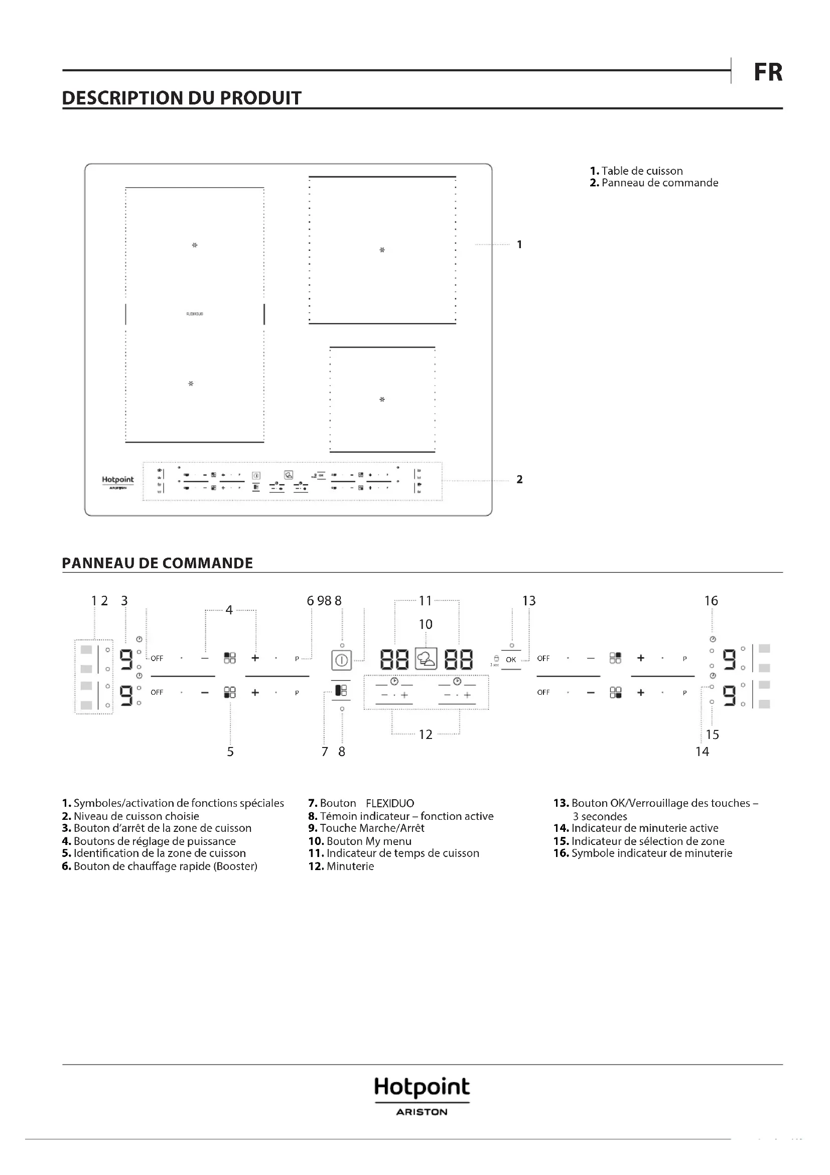 1. Symboles/activation de fonctions spéciales2. Niveau de cuisson choisie3. Bouton d’arrêt de la zone de cuisson4. Boutons de réglage de puissance5. Identication de la zone de cuisson6. Bouton de chauage rapide (Booster)7. Bouton FLEXIDUO8. Témoin indicateur – fonction active9. Touche Marche/Arrêt10. Bouton Mymenu11. Indicateur de temps de cuisson12. Minuterie13. Bouton OK/Verrouillage des touches – 3secondes14. Indicateur de minuterie active15. Indicateur de sélection de zone16. Symbole indicateur de minuterie