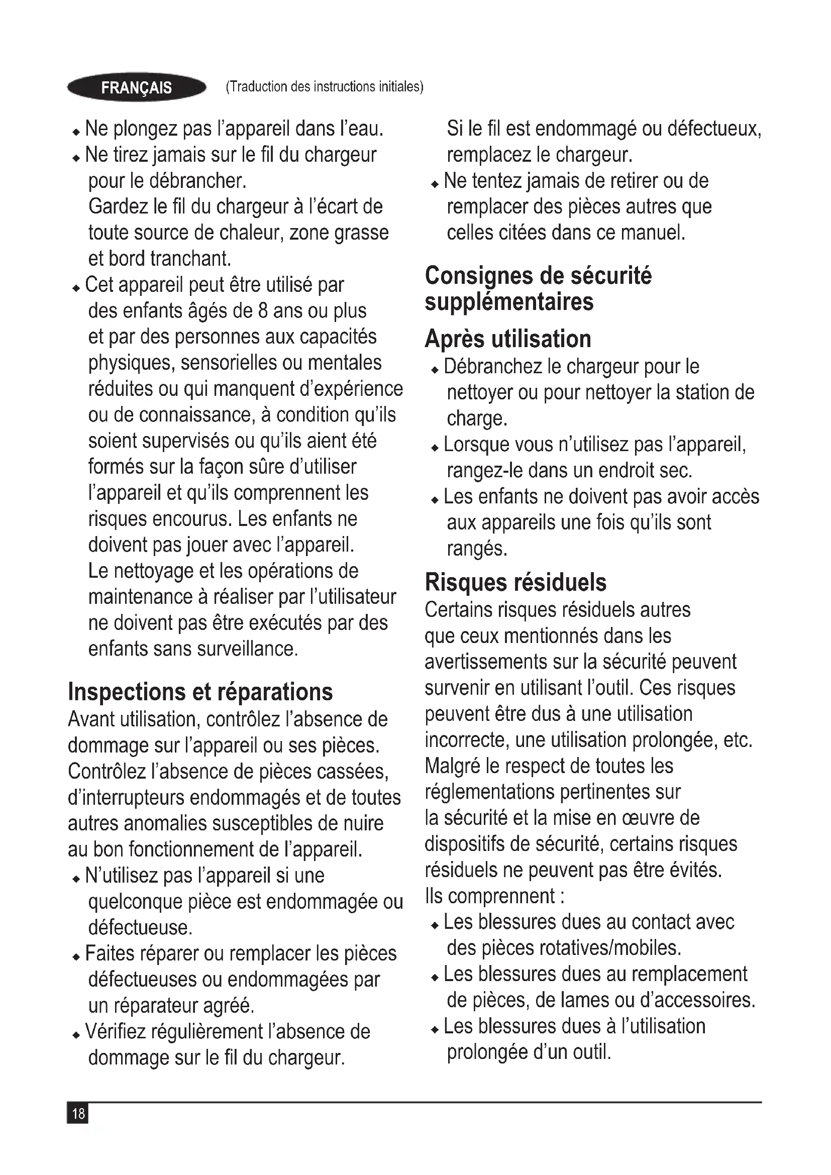 Avertissement ! Veillez à lire tous les avertissements sur la sécurité et toutes les instructions. Le non-respect des avertissements et des instructions listés ci-dessous peut occasionner des décharges électriques, des incendies et/ou de graves blessures. u L’utilisation prévue est décrite dans ce manuel. L’utilisation d’un accessoire ou d’un équipement autre que ceux recommandés dans ce manuel et l’utilisation de cet appareil à d’autres ns que celles recommandées dans ce manuel d’utilisation peuvent entraîner un risque de blessures. u Conservez ce manuel pour pouvoir vous y référer dans le futur. Utiliser votre appareil u N’utilisez pas cet appareil pour aspirer des liquides ou des matières qui pourraient prendre feu. u N’utilisez pas l’appareil sans que le sac à poussière et/ou les ltres ne soient en place u N’utilisez pas cet appareil près d’une source d’eau.18 (Traduction des instructions initiales) FRANÇAIS u Ne plongez pas l’appareil dans l’eau.u Ne tirez jamais sur le l du chargeur pour le débrancher. Gardez le l du chargeur à l’écart de toute source de chaleur, zone grasse et bord tranchant. u Cet appareil peut être utilisé par des enfants âgés de 8 ans ou plus et par des personnes aux capacités physiques, sensorielles ou mentales réduites ou qui manquent d’expérience ou de connaissance, à condition qu’ils soient supervisés ou qu’ils aient été formés sur la façon sûre d’utiliser l’appareil et qu’ils comprennent les risques encourus. Les enfants ne doivent pas jouer avec l’appareil. Le nettoyage et les opérations de maintenance à réaliser par l’utilisateur ne doivent pas être exécutés par des enfants sans surveillance. Inspections et réparations Avant utilisation, contrôlez l’absence de dommage sur l’appareil ou ses pièces. Contrôlez l’absence de pièces cassées, d’interrupteurs endommagés et de toutes autres anomalies susceptibles de nuire au bon fonctionnement de l’appareil. u N’utilisez pas l’appareil si une quelconque pièce est endommagée ou défectueuse. u Faites réparer ou remplacer les pièces défectueuses ou endommagées par un réparateur agréé. u Vériez régulièrement l’absence de dommage sur le l du chargeur. Si le l est endommagé ou défectueux, remplacez le chargeur. u Ne tentez jamais de retirer ou de remplacer des pièces autres que celles citées dans ce manuel. Consignes de sécurité supplémentaires Après utilisation u Débranchez le chargeur pour le nettoyer ou pour nettoyer la station de charge. u Lorsque vous n’utilisez pas l’appareil, rangez-le dans un endroit sec. u Les enfants ne doivent pas avoir accès aux appareils une fois qu’ils sont rangés. Risques résiduels Certains risques résiduels autres que ceux mentionnés dans les avertissements sur la sécurité peuvent survenir en utilisant l’outil. Ces risques peuvent être dus à une utilisation incorrecte, une utilisation prolongée, etc. Malgré le respect de toutes les réglementations pertinentes sur la sécurité et la mise en œuvre de dispositifs de sécurité, certains risques résiduels ne peuvent pas être évités. Ils comprennent : u Les blessures dues au contact avec des pièces rotatives/mobiles. u Les blessures dues au remplacement de pièces, de lames ou d’accessoires. u Les blessures dues à l’utilisation prolongée d’un outil.19 (Traduction des instructions initiales) FRANÇAIS Lorsque vous utilisez un outil quel qu’il soit pendant de longues périodes, veillez à faire des pauses régulières. u Les troubles de l’ouïe.u Les risques pour la santé provoqués par l’inhalation des poussières générées pendant l’utilisation de votre outil (exemple : travail avec du bois, surtout le chêne, le hêtre et les panneaux en MDF). Batteries et chargeurs Batteries (peuvent être vendues séparément) u Les batteries rechargeables doivent être retirées de l’appareil avant d’être rechargées. u Les batteries doivent être installées en respectant la polarité. u Les batteries usagées doivent être retirées de l’appareil et jetées de façon sûre. u Retirez les batteries si l’appareil doit rester longtemps sans être utilisé. u Les bornes d’alimentation ne doivent pas être mises en court-circuit. u Ne tentez de les ouvrir sous aucun prétexte. u N’exposez pas la batterie à l’eau.u N’exposez pas la batterie à la chaleur.u Ne stockez pas la batterie dans des endroits où la température peut dépasser 40°C. u Ne les rechargez qu’à une température ambiante comprise entre 10°C et 40°C. u Ne procédez à la charge qu’avec le chargeur fourni avec l’appareil/outil. L’utilisation d’un chargeur inadapté peut occasionner une décharge électrique ou la surchauffe de la batterie. u Au moment de jeter les batteries, respectez les instructions mentionnées dans la section “Protection de l’environnement”. u Ne déformez/n’endommagez pas le bloc-batterie en le perçant ou en le cognant car cela pourrait entraîner des blessures et un incendie. u Ne rechargez pas des batteries endommagées. u Dans des conditions extrêmes, la batterie peut fuir. Si vous détectez une fuite, utilisez un chiffon pour essuyer le liquide avec précaution. Évitez tout contact avec la peau. u En cas de contact avec la peau ou les yeux, respectez les consignes mentionné ci-dessous. Avertissement ! Le liquide de la batterie peut provoquer des blessures ou des dégâts matériels. En cas de contact avec la peau, rincez immédiatement à l’eau. Si des rougeurs, une douleur ou une irritation se produisent, consultez un médecin. En cas de contact avec les yeux, rincez immédiatement à l’eau et consultez un médecin. Chargeurs (peuvent être vendus séparément) Votre chargeur a été conçu pour une tension spécique.20 (Traduction des instructions initiales) FRANÇAIS Vériez toujours que la tension du réseau électrique correspond à ce