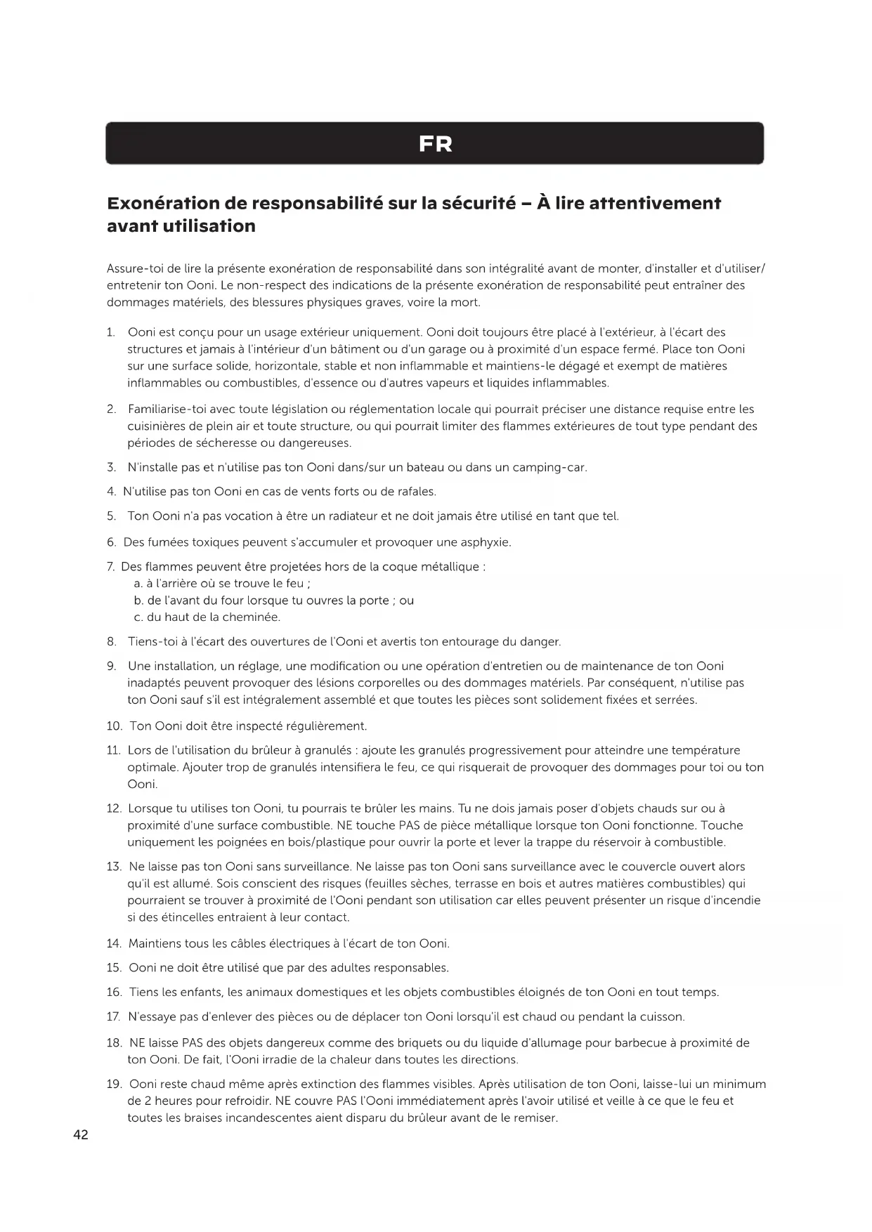 Exonération de responsabilité sur la sécurité – À lire attentivement avant utilisation Assure-toi de lire la présente exonération de responsabilité dans son intégralité avant de monter, d'installer et d'utiliser/ entretenir ton Ooni. Le non-respect des indications de la présente exonération de responsabilité peut entraîner des dommages matériels, des blessures physiques graves, voire la mort.