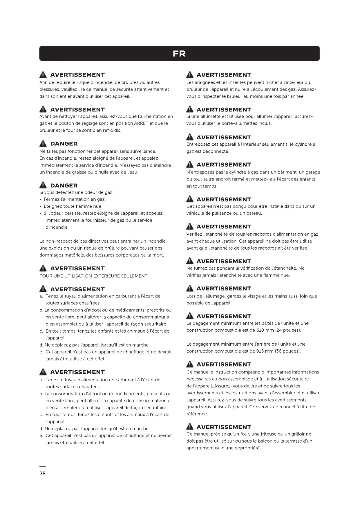 Pour une utilisation extérieure seulement. Si l'appareil est rangé à l'intérieur, retirez le cylindre et laissez-le à l'extérieur. Ne rangez pas le cylindre à gaz de rechange LP sous l'appareil ou à proximité. Ne remplissez jamais le cylindre à plus de 80 % de sa capacité. Le non-respect des consignes ci-dessus pourrait causer un incendie mortel ou de blessures graves. Le dégagement minimum entre les côtés de l'unité et une construction combustible est de 36 po des côtés et de 36 po du devant. N'utilisez pas l'appareil sous des surfaces combustibles.