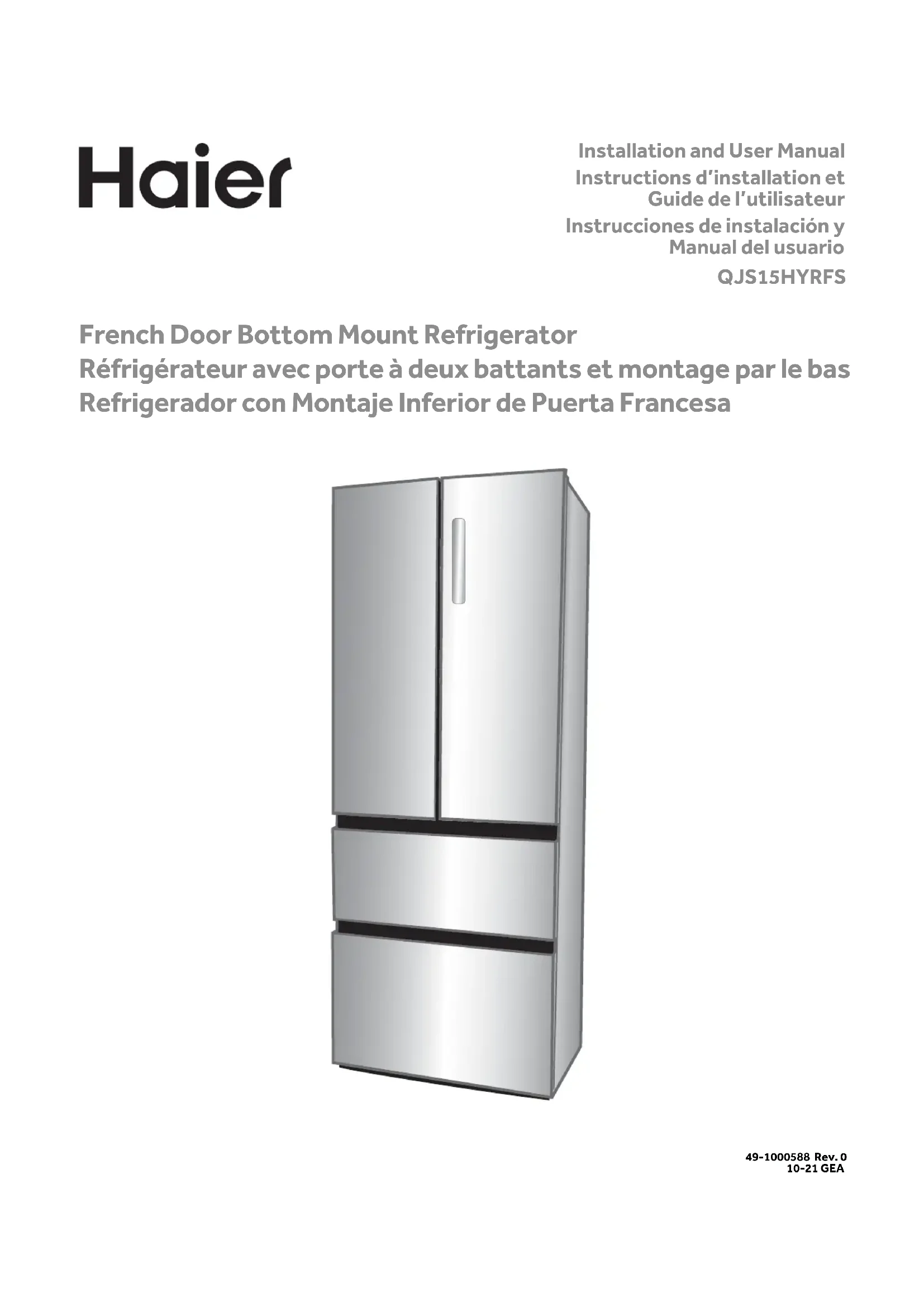 Installation and User Manual Instructions d’installation et Guide de l’utilisateur Instrucciones de instalación y Manual del usuario QJS15HYRFS French Door Bottom Mount Refrigerator Réfrigérateur avec porte à deux battants et montage par le bas Refrigerador con Montaje Inferior de Puerta Francesa 49-1000588 Rev. 0 10-21 GEA2 49-1000588 Rev. 049-1000588 Rev. 0 3