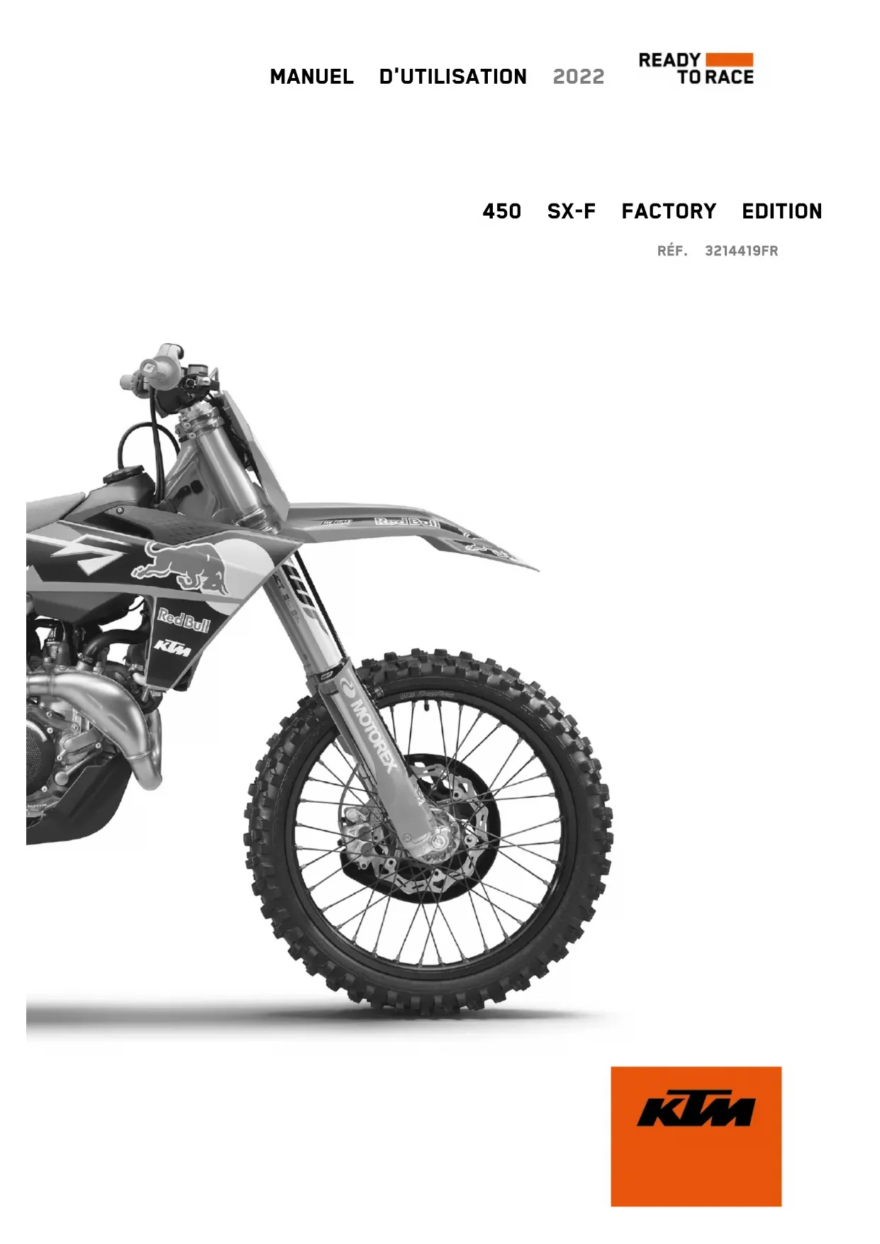 Réf. 3214419frCHER CLIENT KTM, *3214419fr* 3214419fr 04/2022 CHER CLIENT KTM, Permettez-nous de vous féliciter sincèrement d’avoir porté votre choix sur une moto KTM. Vous êtes désormais propriétaire d'un véhicule moderne et sportif qui vous satisfera longtemps si vous l'entretenez de façon appro- priée. Nous vous souhaitons de toujours rouler en toute sécurité ! Inscrire ci-dessous les numéros de série du véhicule. Numéro d’identification du véhicule ( p. 14) Cachet du concessionnaire Numéro de moteur ( p. 14) Le présent manuel d'utilisation correspond à l'état de la série concernée au moment de la publication. Cepen- dant, des divergences minimes résultant de l'évolution technique ne sauraient être exclues. Toutes les informations du présent document sont fournies sans aucun engagement. La société KTM Sportmotor- cycle GmbH se réserve le droit de modifier, de supprimer sans substitution ou d'adapter aux exigences locales les informations techniques, les tarifs, les couleurs, le design, les matériaux, les prestations de services et de main- tenance, les constructions et les équipements ou autres, ainsi que d'arrêter définitivement la fabrication d'un cer- tain modèle sans avis préalable ni indication d'un motif quelconque. La société KTM Sportmotorcycle décline toute responsabilité en ce qui concerne les possibilités de livraison, les divergences au niveau des croquis et des descriptions, ainsi que les fautes d'impression et les erreurs. Les modèles reproduits dans le présent document sont partiellement pourvus d'équipements spéciaux ne faisant pas partie de l'équipement de série. © 2022 KTM Sportmotorcycle GmbH, Mattighofen Autriche Tous droits réservés Toute reproduction, même partielle, est strictement interdite sans autorisation écrite de l’auteur. ISO 9001(12 100 6061) Conformément à la norme internationale de qualité ISO 9001, KTM utilise des standards d'assu- rance qualité permettant d'obtenir une qualité maximale du produit. Établi par : TÜV Management Service KTM Sportmotorcycle GmbH Stallhofnerstraße 3 5230 Mattighofen, Autriche Ce document est valable pour les modèles suivants : 450 SX‑F FACTORY EDITION US (F8475V1)SOMMAIRE