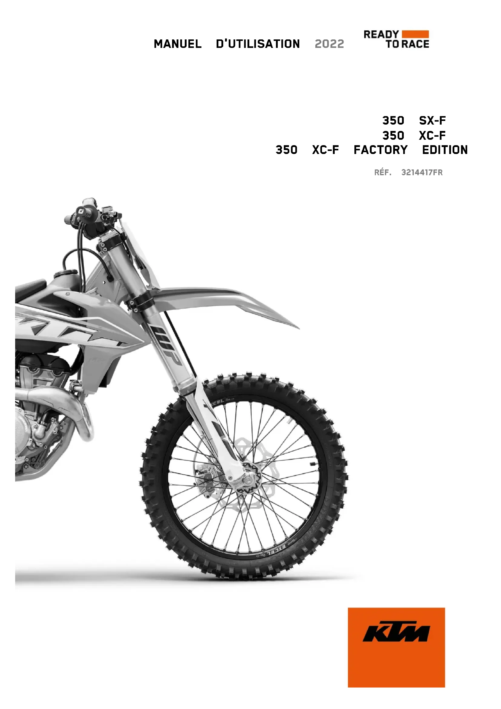 Permettez-nous de vous féliciter sincèrement d’avoir porté votre choix sur une moto KTM. Vous êtes désormais propriétaire d'un véhicule moderne et sportif qui vous satisfera longtemps si vous l'entretenez de façon appro- priée. Nous vous souhaitons de toujours rouler en toute sécurité ! Inscrire ci-dessous les numéros de série du véhicule. Numéro d’identification du véhicule ( p. 15) Cachet du concessionnaire Numéro de moteur ( p. 15) Le présent manuel d'utilisation correspond à l'état de la série concernée au moment de la publication. Cepen- dant, des divergences minimes résultant du perfectionnement de la construction ne sauraient être exclues. Toutes les informations du présent document sont fournies sans aucun engagement. La société KTM Sportmotor- cycle GmbH se réserve le droit de modifier, de supprimer sans substitution ou d'adapter aux exigences locales les informations techniques, les tarifs, les couleurs, le design, les matériaux, les prestations de services et de main- tenance, les constructions et les équipements ou autres, ainsi que d'arrêter définitivement la fabrication d'un cer- tain modèle sans avis préalable ni indication d'un motif quelconque. La société KTM Sportmotorcycle décline toute responsabilité en ce qui concerne les possibilités de livraison, les divergences au niveau des croquis et des descriptions, ainsi que les fautes d'impression et les erreurs. Les modèles reproduits dans le présent document sont partiellement pourvus d'équipements spéciaux ne faisant pas partie de l'équipement de série. © 2021 KTM Sportmotorcycle GmbH, Mattighofen Autriche Tous droits réservés Toute reproduction, même partielle, est strictement interdite sans autorisation écrite de l'auteur. ISO 9001(12 100 6061) Conformément à la norme internationale de qualité ISO 9001, KTM utilise des standards d'assu- rance qualité permettant d'obtenir une qualité maximale du produit. Établi par : TÜV Management Service KTM Sportmotorcycle GmbH Stallhofnerstraße 3 5230 Mattighofen, Autriche Ce document est valable pour les modèles suivants : 350 SX‑F EU (F8201V5) 350 SX‑F US (F8275V5) 350 XC‑F US (F8275V0) 350 XC‑F US FACTORY EDITION (F8275V3)SOMMAIRE